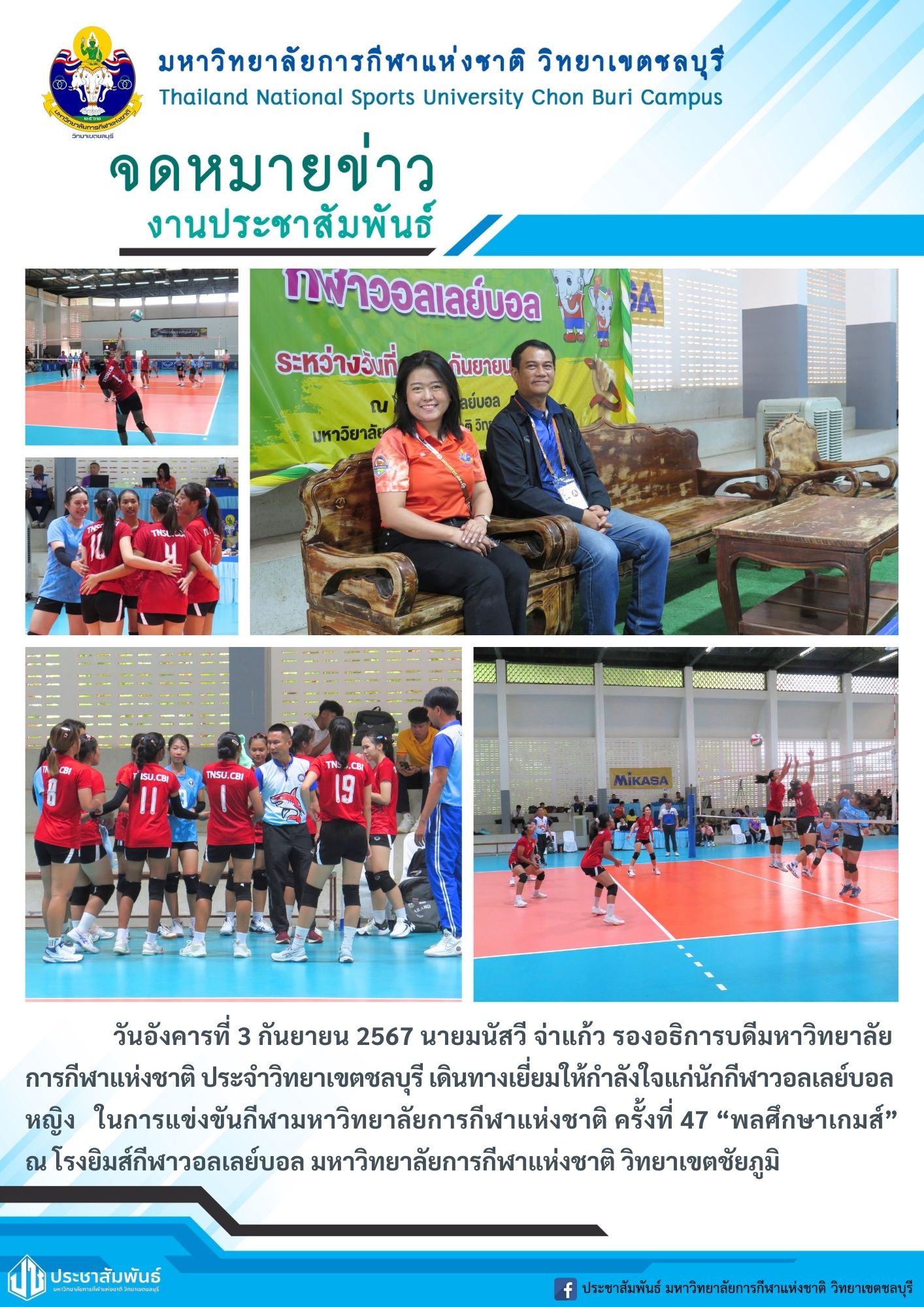 วันอังคารที่ 3 กันยายน 2567 นายมนัสวี จ่าแก้ว รองอธิการบดีมหาวิทยาลัย การกีฬาแห่งชาติ ประจำวิทยาเขตชลบุรี เดินทางเยี่ยมให้กำลังใจแก่นักกีฬาวอลเลย์บอล หญิง ในการแข่งขันกีฬามหาวิทยาลัยการกีฬาแห่งชาติ ครั้งที่ 47 “พลศึกษาเกมส์” ณ โรงยิมส์กีฬาวอลเลย์บอล มหาวิทยาลัยการกีฬาแห่งชาติ วิทยาเขตชัยภูมิ
