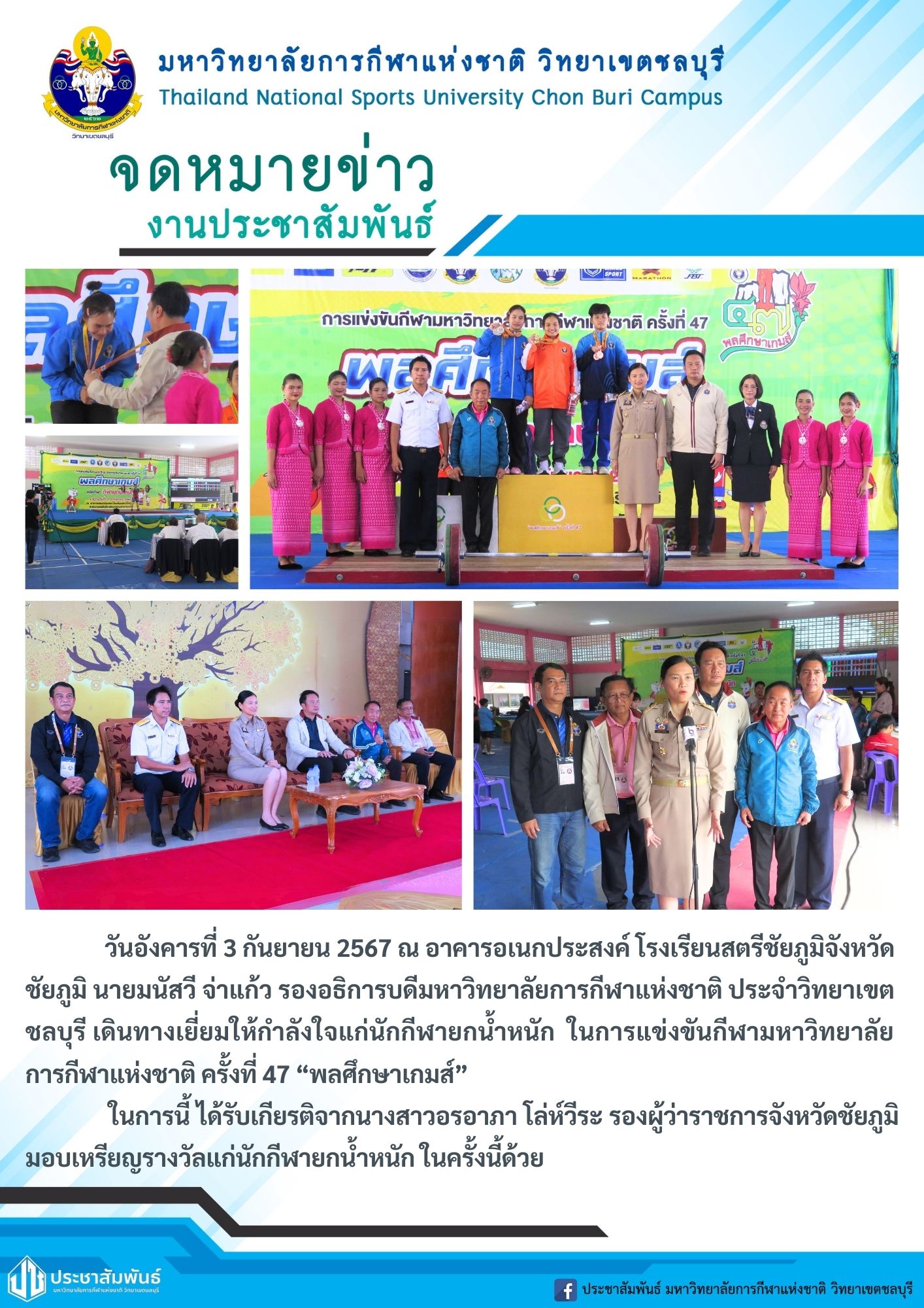 วันอังคารที่ 3 กันยายน 2567 ณ อาคารอเนกประสงค์ โรงเรียนสตรีชัยภูมิจังหวัด ชัยภูมิ นายมนัสวี จ่าแก้ว รองอธิการบดีมหาวิทยาลัยการกีฬาแห่งชาติ ประจำวิทยาเขต ชลบุรี เดินทางเยี่ยมให้กำลังใจแก่นักกีฬายกน้ำหนัก ในการแข่งขันกีฬามหาวิทยาลัย การกีฬาแห่งชาติ ครั้งที่ 47 “พลศึกษาเกมส์” ในการนี้ ได้รับเกียรติจากนางสาวอรอาภา โล่ห์วีระ รองผู้ว่าราชการจังหวัดชัยภูมิ มอบเหรียญรางวัลแก่นักกีฬายกน้ำหนัก ในครั้งนี้ด้วย
