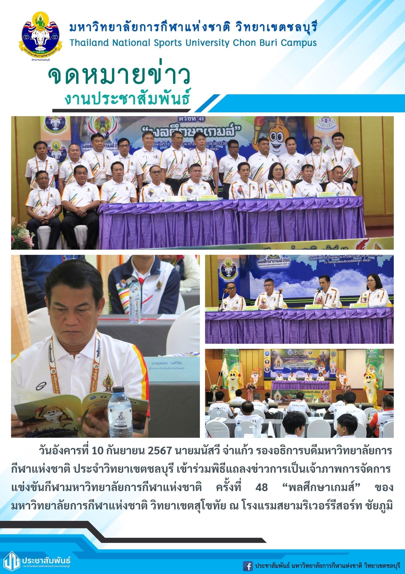 วันอังคารที่ 10 กันยายน 2567 นายมนัสวี จ่าแก้ว รองอธิการบดีมหาวิทยาลัยการ กีฬาแห่งชาติ ประจำวิทยาเขตชลบุรี เข้าร่วมพิธีแถลงข่าวการเป็นเจ้าภาพการจัดการ แข่งขันกีฬามหาวิทยาลัยการกีฬาแห่งชาติ ครั้งที่ 48 “พลศึกษาเกมส์” ของมหาวิทยาลัยการกีฬาแห่งชาติ วิทยาเขตสุโขทัย ณ โรงแรมสยามริเวอร์รีสอร์ท ชัยภูมิ