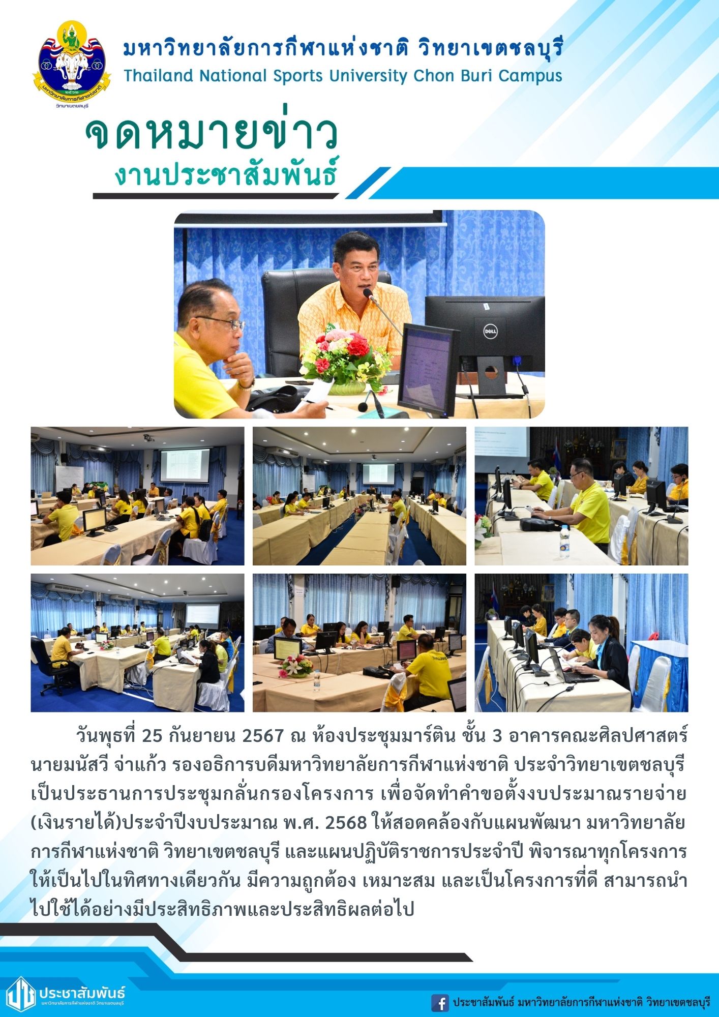 วันพุธที่ 25 กันยายน 2567 ณ ห้องประชุมมาร์ติน ชั้น 3 อาคารคณะศิลปศาสตร์ นายมนัสวี จ่าแก้ว รองอธิการบดีมหาวิทยาลัยการกีฬาแห่งชาติ ประจำวิทยาเขตชลบุรี เป็นประธานการประชุมกลั่นกรองโครงการ เพื่อจัดทำคำขอตั้งงบประมาณรายจ่าย (เงินรายได้)ประจำปีงบประมาณ พ.ศ. 2568 ให้สอดคล้องกับแผนพัฒนา มหาวิทยาลัย การกีฬาแห่งชาติ วิทยาเขตชลบุรี และแผนปฏิบัติราชการประจำปี พิจารณาทุกโครงการ ให้เป็นไปในทิศทางเดียวกัน มีความถูกต้อง เหมาะสม และเป็นโครงการที่ดี สามารถนำไปใช้ได้อย่างมีประสิทธิภาพและประสิทธิผลต่อไป