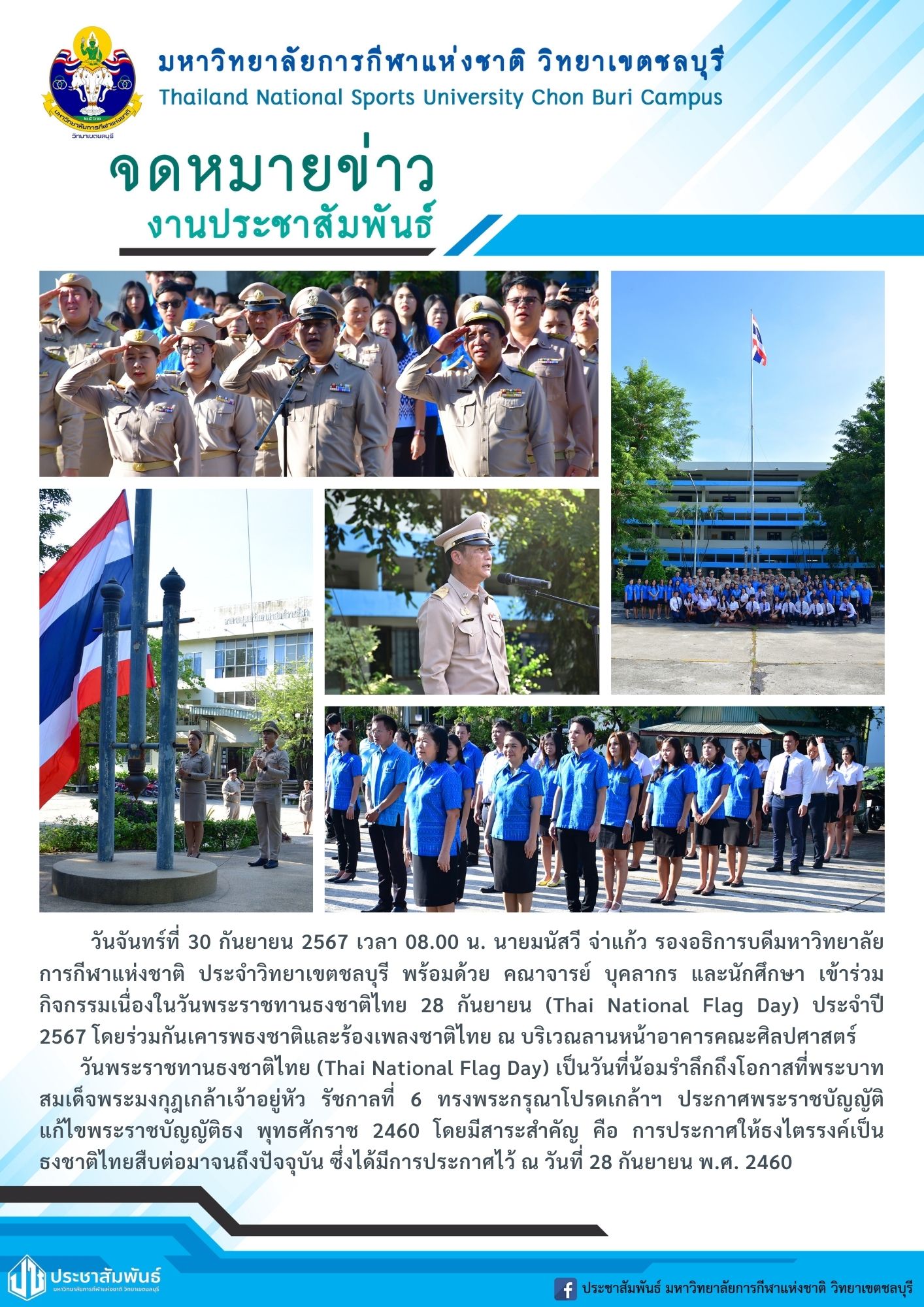 วันจันทร์ที่ 30 กันยายน 2567 เวลา 08.00 น. นายมนัสวี จ่าแก้ว รองอธิการบดีมหาวิทยาลัยการกีฬาแห่งชาติ ประจำวิทยาเขตชลบุรี พร้อมด้วย คณาจารย์ บุคลากร และนักศึกษา เข้าร่วมกิจกรรมเนื่องในวันพระราชทานธงชาติไทย 28 กันยายน (Thai National Flag Day) ประจำปี 2567 โดยร่วมกันเคารพธงชาติและร้องเพลงชาติไทย ณ บริเวณลานหน้าอาคารคณะศิลปศาสตร์ วันพระราชทานธงชาติไทย (Thai National Flag Day) เป็นวันที่น้อมรำลึกถึงโอกาสที่พระบาทสมเด็จพระมงกุฎเกล้าเจ้าอยู่หัว รัชกาลที่ 6 ทรงพระกรุณาโปรดเกล้าฯ ประกาศพระราชบัญญัติแก้ไขพระราชบัญญัติธง พุทธศักราช 2460 โดยมีสาระสำคัญ คือ การประกาศให้ธงไตรรงค์เป็นธงชาติไทยสืบต่อมาจนถึงปัจจุบัน ซึ่งได้มีการประกาศไว้ ณ วันที่ 28 กันยายน พ.ศ. 2460