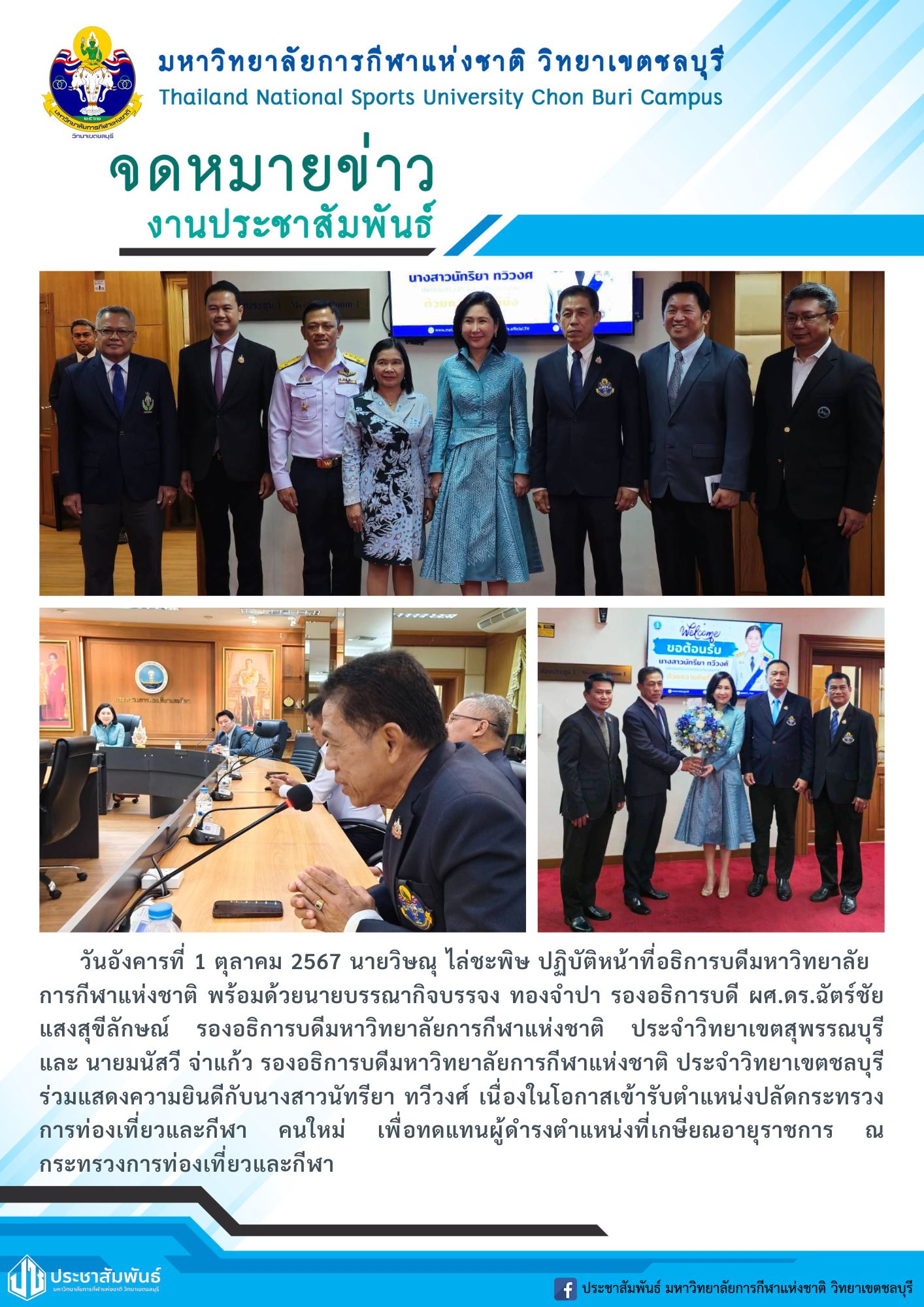 วันอังคารที่ 1 ตุลาคม 2567 นายวิษณุ ไล่ชะพิษ ปฏิบัติหน้าที่อธิการบดีมหาวิทยาลัยการกีฬาแห่งชาติ พร้อมด้วยนายบรรณากิจบรรจง ทองจำปา รองอธิการบดี ผศ.ดร.ฉัตร์ชัย แสงสุขีลักษณ์ รองอธิการบดีมหาวิทยาลัยการกีฬาแห่งชาติ ประจำวิทยาเขตสุพรรณบุรี และ นายมนัสวี จ่าแก้ว รองอธิการบดีมหาวิทยาลัยการกีฬาแห่งชาติ ประจำวิทยาเขตชลบุรี ร่วมแสดงความยินดีกับนางสาวนัทรียา ทวีวงศ์ เนื่องในโอกาสเข้ารับตำแหน่งปลัดกระทรวงการท่องเที่ยวและกีฬา คนใหม่ เพื่อทดแทนผู้ดำรงตำแหน่งที่เกษียณอายุราชการ ณ กระทรวงการท่องเที่ยวและกีฬา