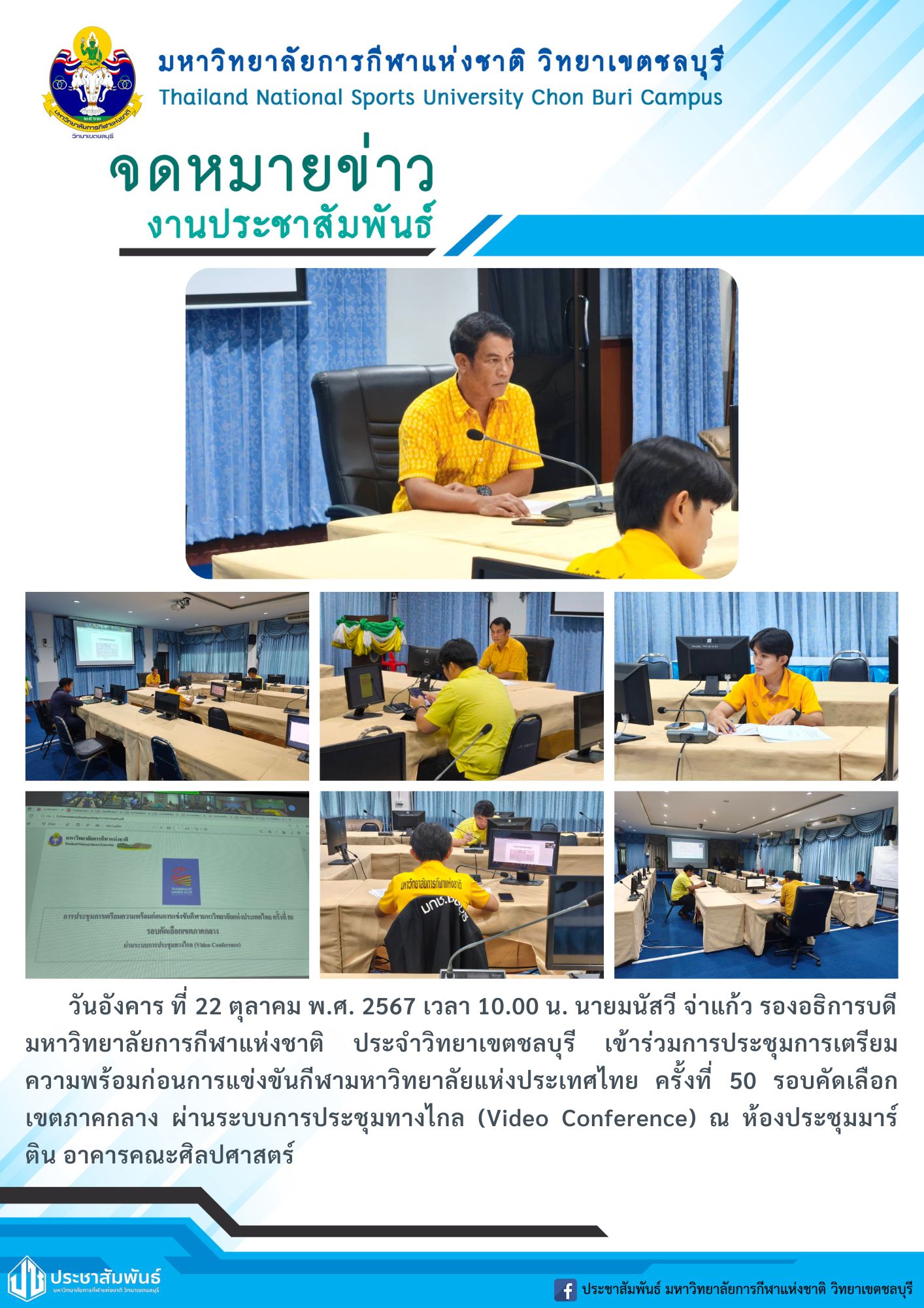 วันอังคาร ที่ 22 ตุลาคม พ.ศ. 2567 เวลา 10.00 น. นายมนัสวี จ่าแก้ว รองอธิการบดีมหาวิทยาลัยการกีฬาแห่งชาติ ประจำวิทยาเขตชลบุรี เข้าร่วมการประชุมการเตรียมความพร้อมก่อนการแข่งขันกีฬามหาวิทยาลัยแห่งประเทศไทย ครั้งที่ 50 รอบคัดเลือกเขตภาคกลาง ผ่านระบบการประชุมทางไกล (Video Conference) ณ ห้องประชุมมาร์ติน อาคารคณะศิลปศาสตร์