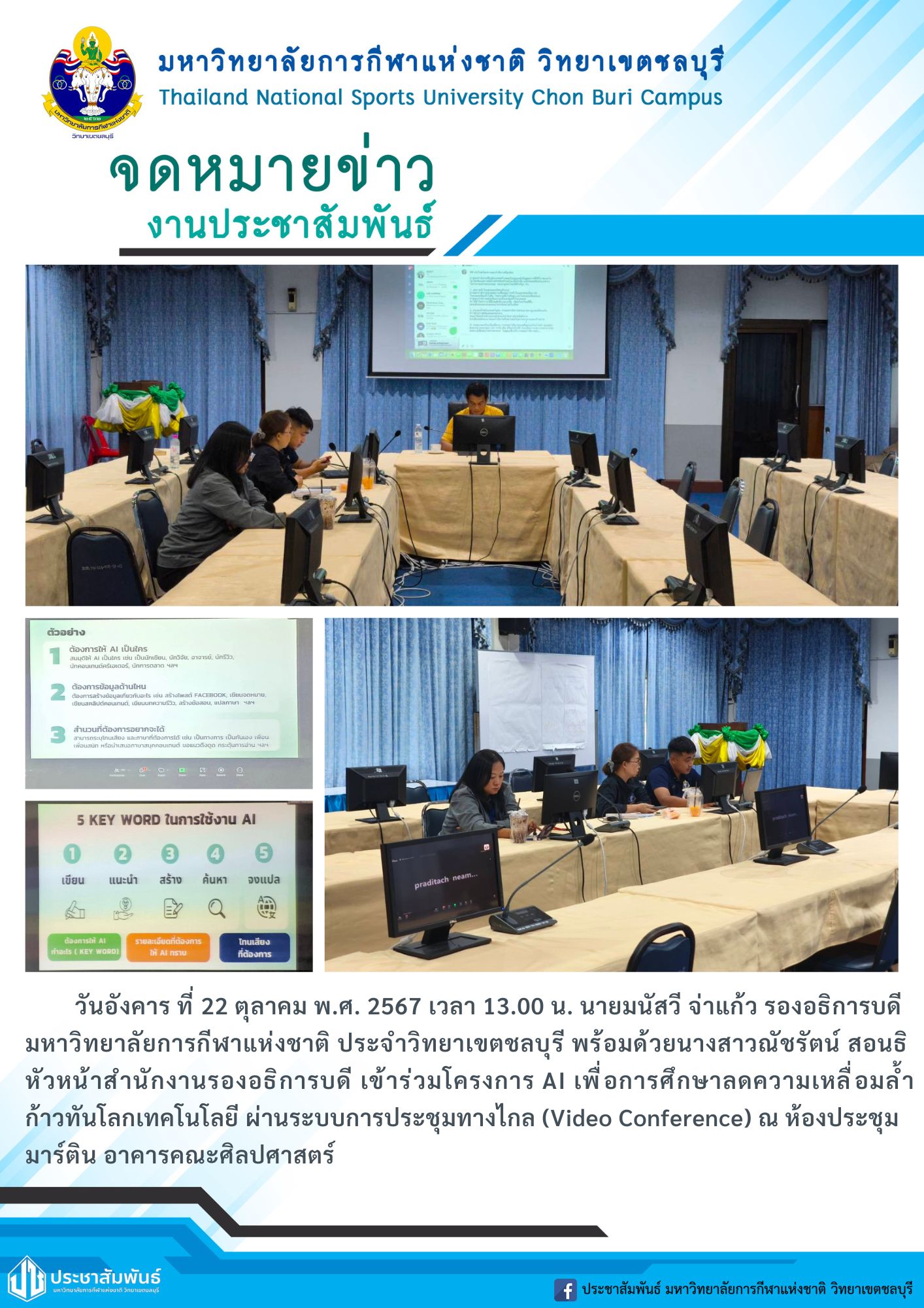 วันอังคาร ที่ 22 ตุลาคม พ.ศ. 2567 เวลา 13.00 น. นายมนัสวี จ่าแก้ว รองอธิการบดี มหาวิทยาลัยการกีฬาแห่งชาติ ประจำวิทยาเขตชลบุรี พร้อมด้วยนางสาวณัชรัตน์ สอนธิ หัวหน้าสำนักงานรองอธิการบดี เข้าร่วมโครงการ AI เพื่อการศึกษาลดความเหลื่อมล้ำ ก้าวทันโลกเทคโนโลยี ผ่านระบบการประชุมทางไกล (Video Conference) ณ ห้องประชุม มาร์ติน อาคารคณะศิลปศาสตร์.jpg)