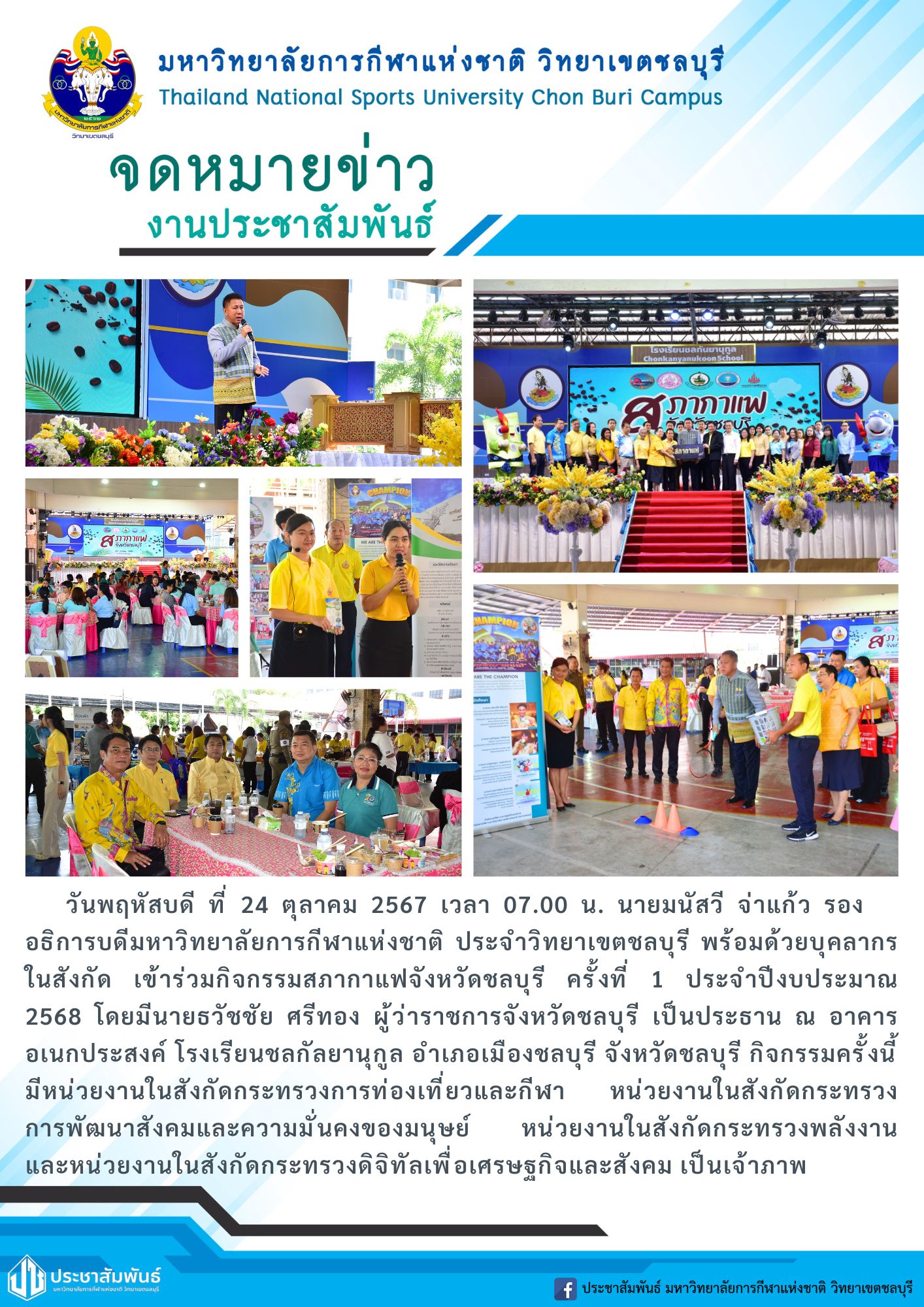 วันพฤหัสบดี ที่ 24 ตุลาคม 2567 เวลา 07.00 น. นายมนัสวี จ่าแก้ว รองอธิการบดีมหาวิทยาลัยการกีฬาแห่งชาติ ประจำวิทยาเขตชลบุรี พร้อมด้วยบุคลากรในสังกัด เข้าร่วมกิจกรรมสภากาแฟจังหวัดชลบุรี ครั้งที่ 1 ประจำปีงบประมาณ 2568 โดยมีนายธวัชชัย ศรีทอง ผู้ว่าราชการจังหวัดชลบุรี เป็นประธาน ณ อาคารอเนกประสงค์ โรงเรียนชลกัลยานุกูล อำเภอเมืองชลบุรี จังหวัดชลบุรี กิจกรรมครั้งนี้มีหน่วยงานในสังกัดกระทรวงการท่องเที่ยวและกีฬา หน่วยงานในสังกัดกระทรวงการพัฒนาสังคมและความมั่นคงของมนุษย์ หน่วยงานในสังกัดกระทรวงพลังงาน และหน่วยงานในสังกัดกระทรวงดิจิทัลเพื่อเศรษฐกิจและสังคม เป็นเจ้าภาพ