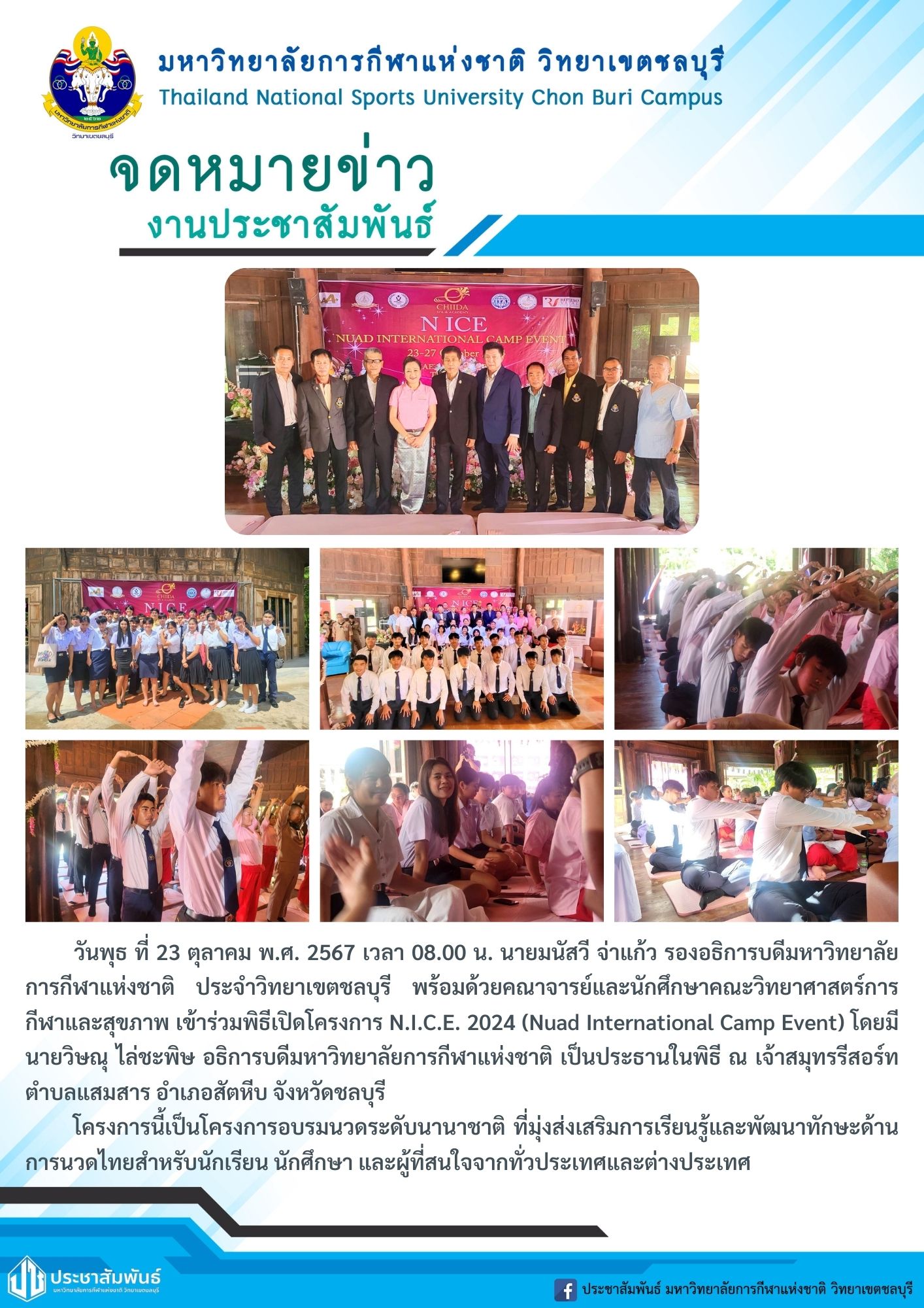 วันพุธ ที่ 23 ตุลาคม พ.ศ. 2567 เวลา 08.00 น. นายมนัสวี จ่าแก้ว รองอธิการบดีมหาวิทยาลัยการกีฬาแห่งชาติ ประจำวิทยาเขตชลบุรี พร้อมด้วยคณาจารย์และนักศึกษาคณะวิทยาศาสตร์การกีฬาและสุขภาพ เข้าร่วมพิธีเปิดโครงการ N.I.C.E. 2024 (Nuad International Camp Event) โดยมีนายวิษณุ ไล่ชะพิษ อธิการบดีมหาวิทยาลัยการกีฬาแห่งชาติ เป็นประธานในพิธี ณ เจ้าสมุทรรีสอร์ท ตำบลแสมสาร อำเภอสัตหีบ จังหวัดชลบุรี โครงการนี้เป็นโครงการอบรมนวดระดับนานาชาติ ที่มุ่งส่งเสริมการเรียนรู้และพัฒนาทักษะด้านการนวดไทยสำหรับนักเรียน นักศึกษา และผู้ที่สนใจจากทั่วประเทศและต่างประเทศ