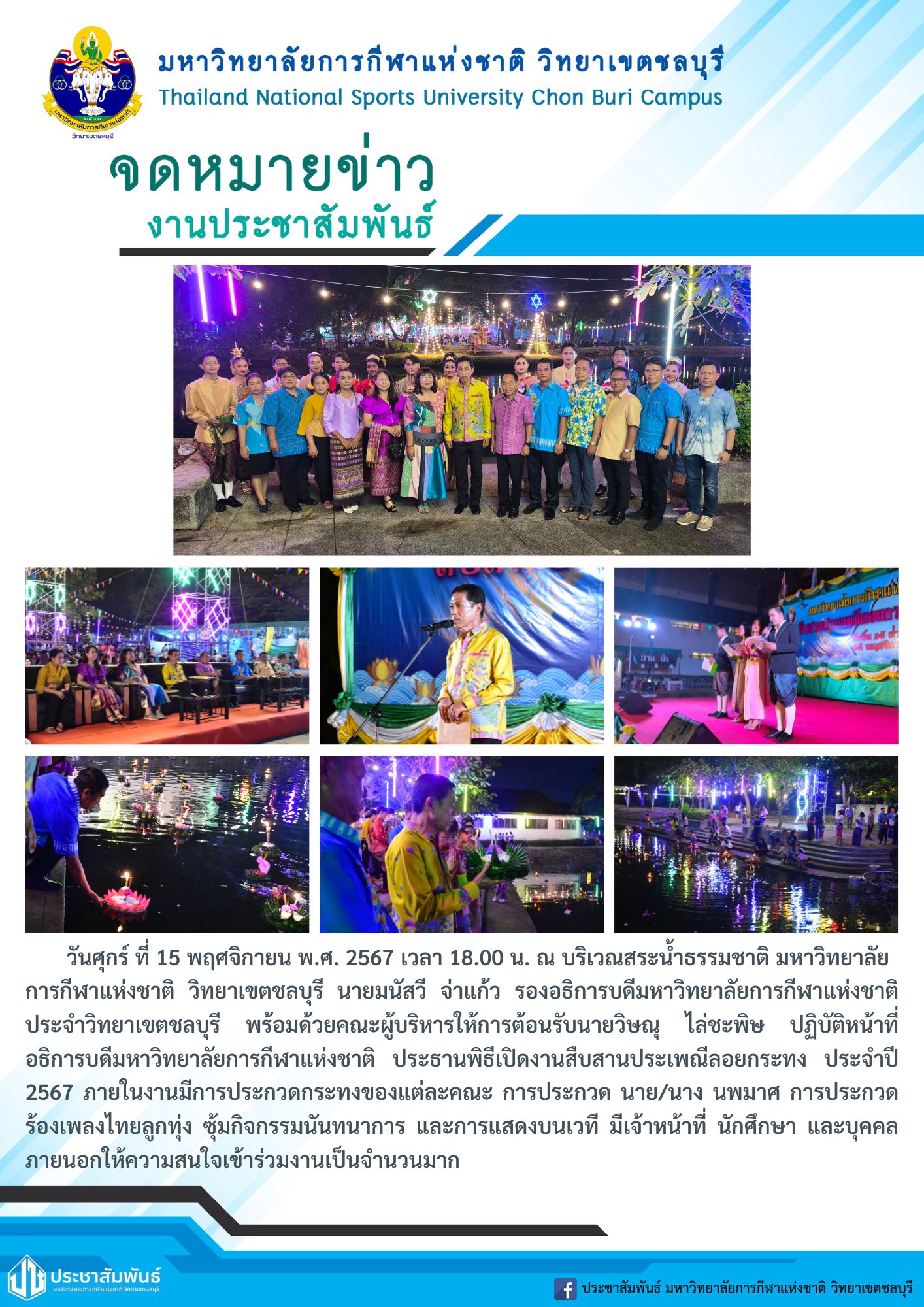 วันศุกร์ ที่ 15 พฤศจิกายน พ.ศ. 2567 เวลา 18.00 น. ณ บริเวณสระน้ำธรรมชาติ มหาวิทยาลัยการกีฬาแห่งชาติ วิทยาเขตชลบุรี นายมนัสวี จ่าแก้ว รองอธิการบดีมหาวิทยาลัยการกีฬาแห่งชาติ ประจำวิทยาเขตชลบุรี พร้อมด้วยคณะผู้บริหารให้การต้อนรับนายวิษณุ ไล่ชะพิษ ปฏิบัติหน้าที่อธิการบดีมหาวิทยาลัยการกีฬาแห่งชาติ ประธานพิธีเปิดงานสืบสานประเพณีลอยกระทง ประจำปี 2567 ภายในงานมีการประกวดกระทงของแต่ละคณะ การประกวด นาย/นาง นพมาศ การประกวดร้องเพลงไทยลูกทุ่ง ซุ้มกิจกรรมนันทนาการ และการแสดงบนเวที มีเจ้าหน้าที่ นักศึกษา และบุคคลภายนอกให้ความสนใจเข้าร่วมงานเป็นจำนวนมาก