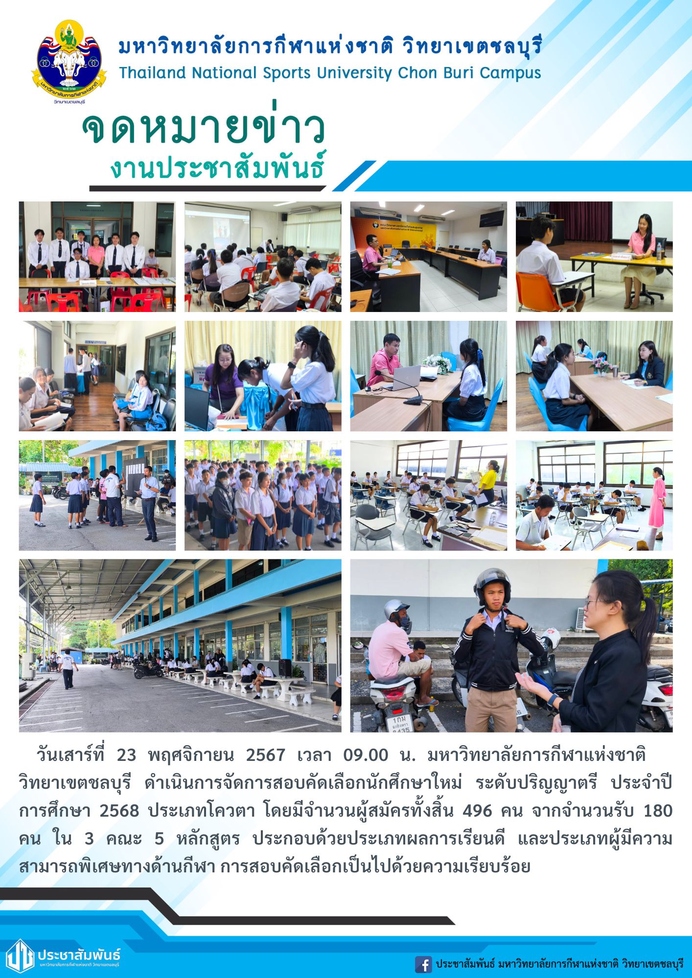 วันเสาร์ที่ 23 พฤศจิกายน 2567 เวลา 09.00 น. มหาวิทยาลัยการกีฬาแห่งชาติ วิทยาเขตชลบุรี ดำเนินการจัดการสอบคัดเลือกนักศึกษาใหม่ ระดับปริญญาตรี ประจำปีการศึกษา 2568 ประเภทโควตา โดยมีจำนวนผู้สมัครทั้งสิ้น 496 คน จากจำนวนรับ 180 คน ใน 3 คณะ 5 หลักสูตร ประกอบด้วยประเภทผลการเรียนดี และประเภทผู้มีความสามารถพิเศษทางด้านกีฬา การสอบคัดเลือกเป็นไปด้วยความเรียบร้อย