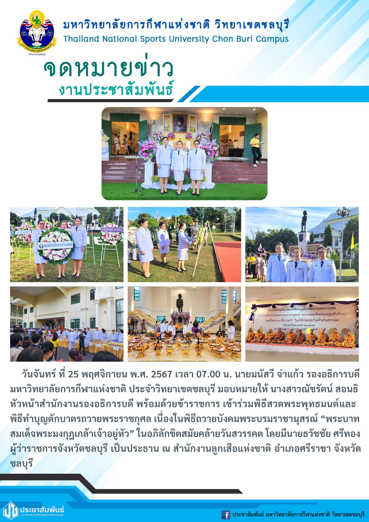 วันจันทร์ ที่ 25 พฤศจิกายน พ.ศ. 2567 เวลา 07.00 น. นายมนัสวี จ่าแก้ว รองอธิการบดีมหาวิทยาลัยการกีฬาแห่งชาติ ประจำวิทยาเขตชลบุรี มอบหมายให้ นางสาวณัชรัตน์ สอนธิ หัวหน้าสำนักงานรองอธิการบดี พร้อมด้วยข้าราชการ เข้าร่วมพิธีสวดพระพุทธมนต์และ พิธีทำบุญตักบาตรถวายพระราชกุศล เนื่องในพิธีถวายบังคมพระบรมราชานุสรณ์ “พระบาท สมเด็จพระมงกุฎเกล้าเจ้าอยู่หัว” ในอภิลักขิตสมัยคล้ายวันสวรรคต โดยมีนายธวัชชัย ศรีทอง ผู้ว่าราชการจังหวัดชลบุรี เป็นประธาน ณ สำนักงานลูกเสือแห่งชาติ อำเภอศรีราชา จังหวัดชลบุรี.jpg)
