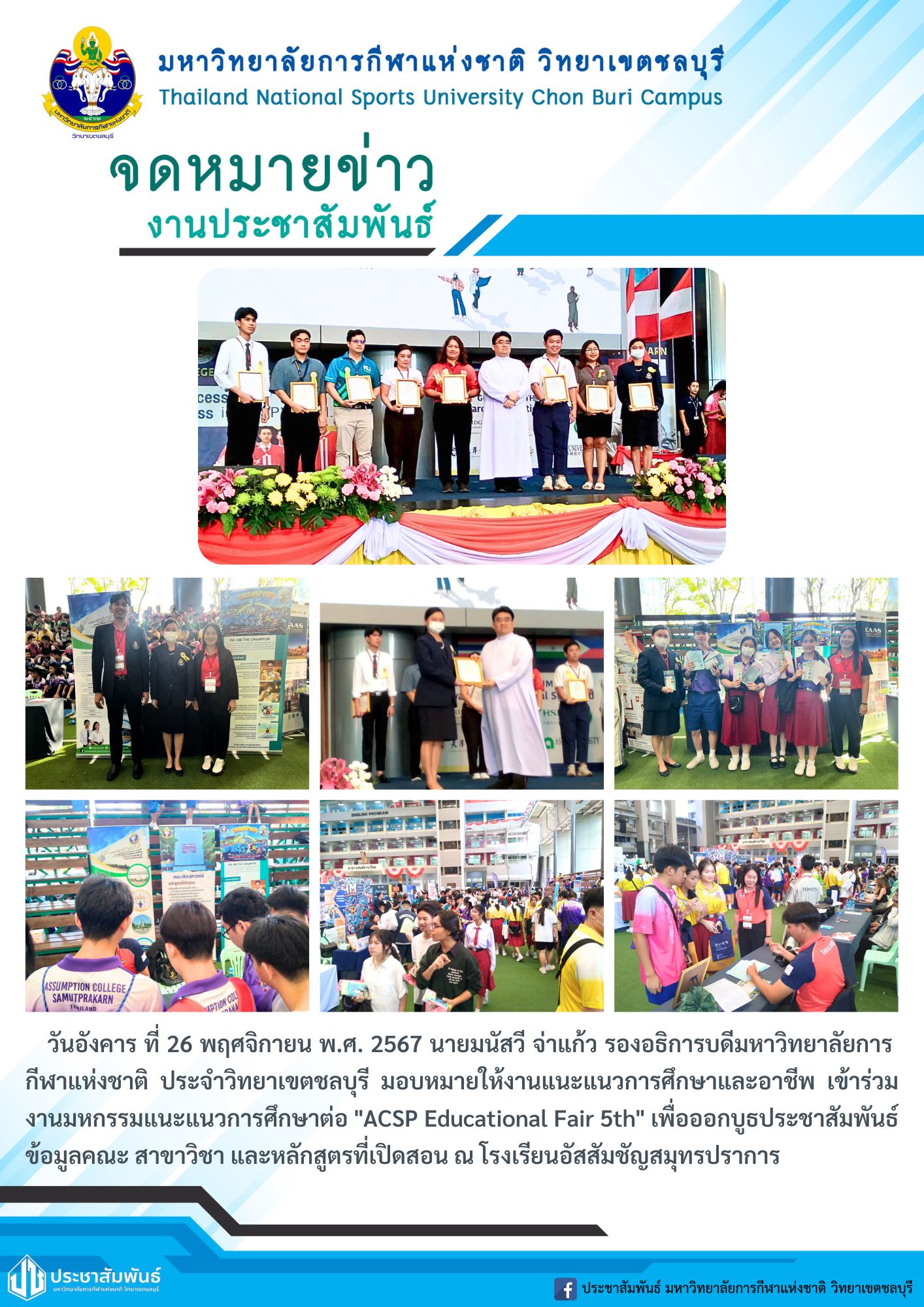 วันอังคาร ที่ 26 พฤศจิกายน พ.ศ. 2567 นายมนัสวี จ่าแก้ว รองอธิการบดีมหาวิทยาลัยการกีฬาแห่งชาติ ประจำวิทยาเขตชลบุรี มอบหมายให้งานแนะแนวการศึกษาและอาชีพ เข้าร่วมงานมหกรรมแนะแนวการศึกษาต่อ "ACSP Educational Fair 5th" เพื่อออกบูธประชาสัมพันธ์ข้อมูลคณะ สาขาวิชา และหลักสูตรที่เปิดสอน ณ โรงเรียนอัสสัมชัญสมุทรปราการ