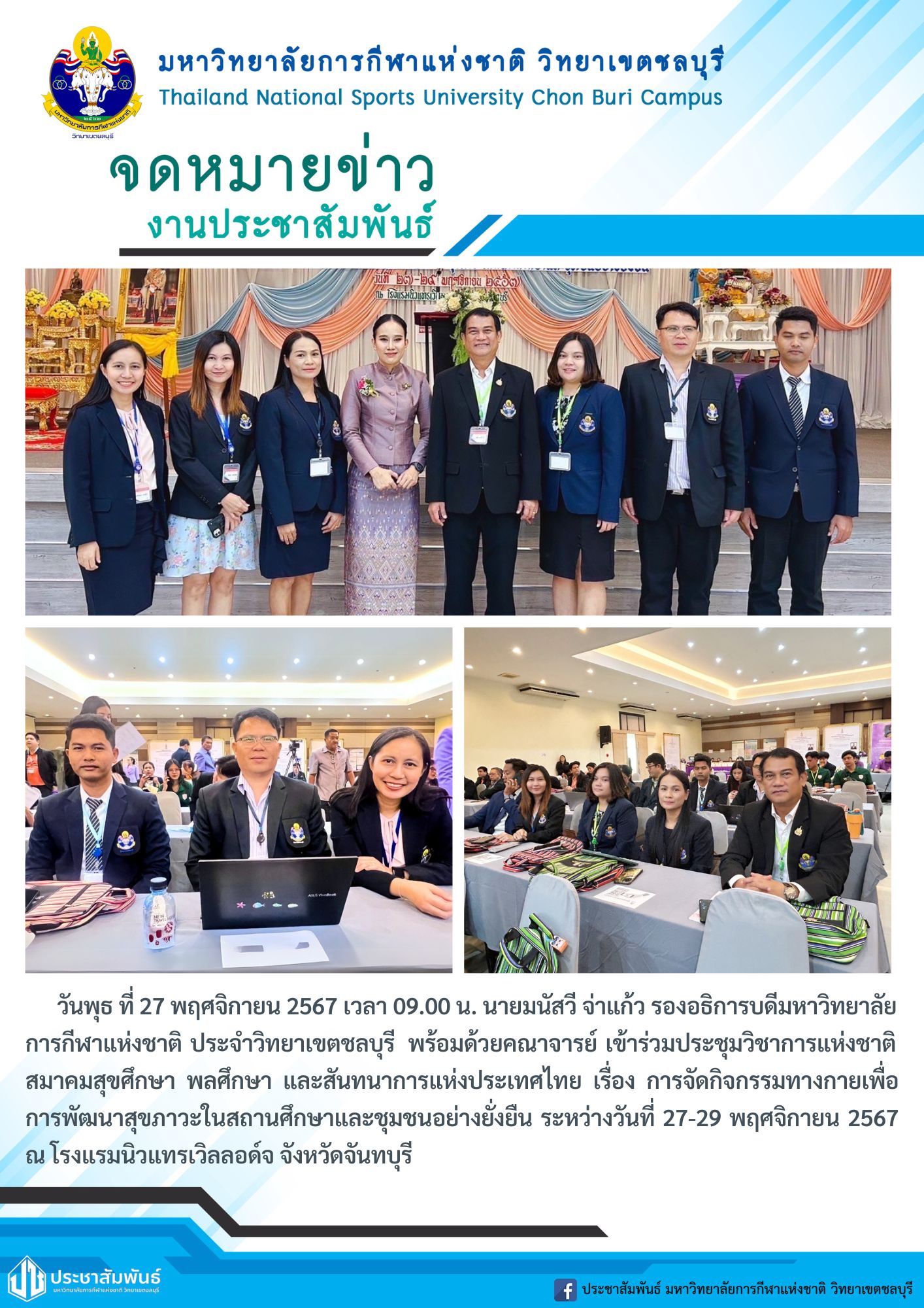 วันพุธ ที่ 27 พฤศจิกายน 2567 เวลา 09.00 น. นายมนัสวี จ่าแก้ว รองอธิการบดีมหาวิทยาลัยการกีฬาแห่งชาติ ประจำวิทยาเขตชลบุรี พร้อมด้วยคณาจารย์ เข้าร่วมประชุมวิชาการแห่งชาติ สมาคมสุขศึกษา พลศึกษา และสันทนาการแห่งประเทศไทย เรื่อง การจัดกิจกรรมทางกายเพื่อการพัฒนาสุขภาวะในสถานศึกษาและชุมชนอย่างยั่งยืน ระหว่างวันที่ 27-29 พฤศจิกายน 2567 ณ โรงแรมนิวแทรเวิลลอด์จ จังหวัดจันทบุรี