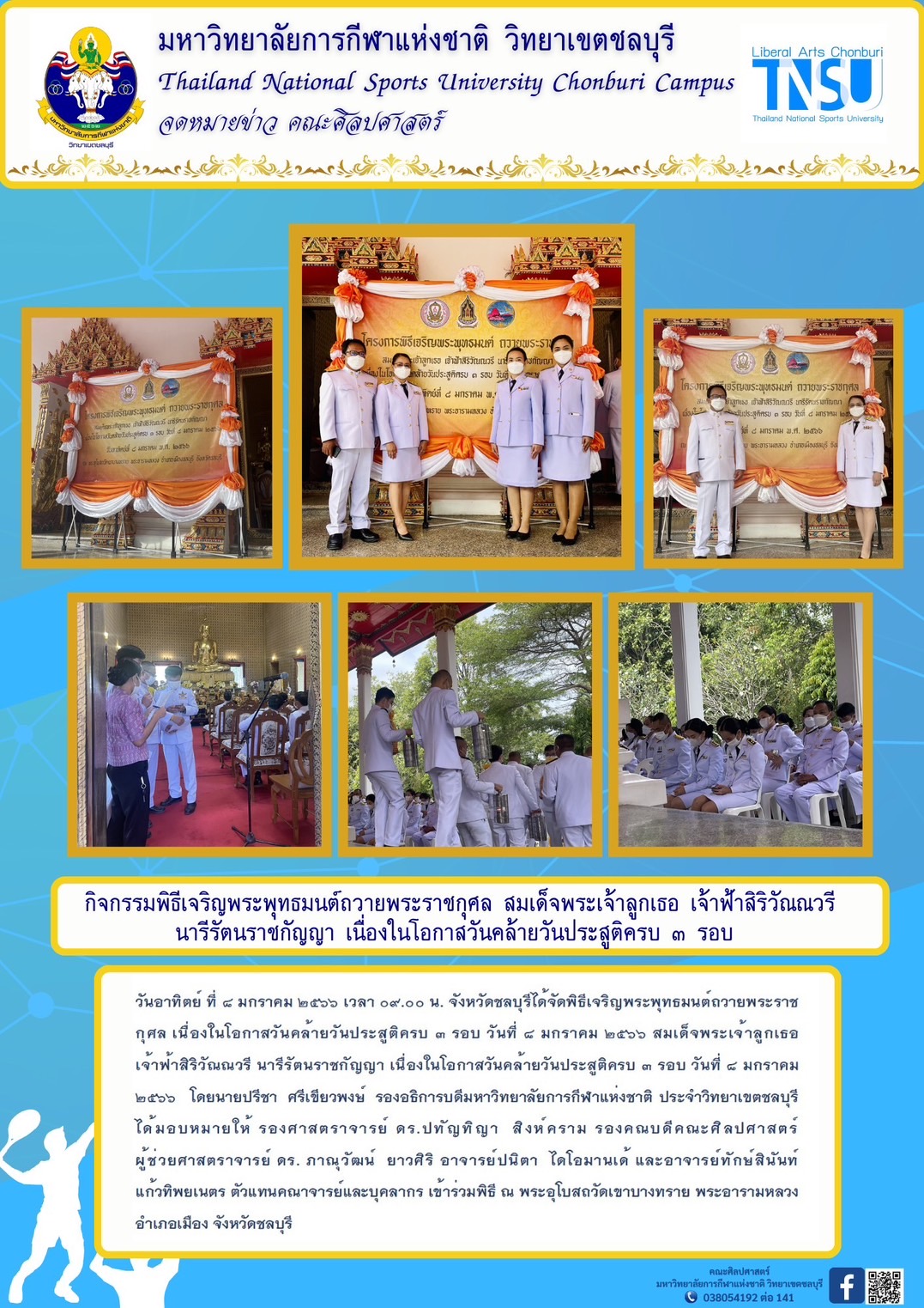 วันที่ 8 มกราคม 2566 จังหวัดชลบุรีได้จัดพิธีเจริญพระพุทธมนต์ถวายพระราชกุศล สมเด็จพระเจ้าลูกเธอ เจ้าฟ้าสิริวัณณวรีนารีรัตนราชกัญญา เนื่องในโอกาสวันคล้ายวันประสูติครบ 3 รอบ โดยมีคณาจารย์ มหาวิทยาลัยการกีฬาแห่งชาติ วิทยาเขตชลบุรีเข้าร่วมพิธี