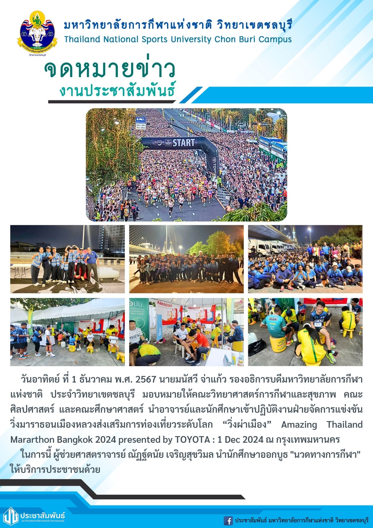 วันอาทิตย์ ที่ 1 ธันวาคม พ.ศ. 2567 นายมนัสวี จ่าแก้ว รองอธิการบดีมหาวิทยาลัยการกีฬาแห่งชาติ ประจำวิทยาเขตชลบุรี มอบหมายให้คณะวิทยาศาสตร์การกีฬาและสุขภาพ คณะศิลปศาสตร์ และคณะศึกษาศาสตร์ นำอาจารย์และนักศึกษาเข้าปฏิบัติงานฝ่ายจัดการแข่งขันวิ่งมาราธอนเมืองหลวงส่งเสริมการท่องเที่ยวระดับโลก “วิ่งผ่าเมือง” Amazing Thailand Mararthon Bangkok 2024 presented by TOYOTA : 1 Dec 2024 ณ กรุงเทพมหานคร ในการนี้ ผู้ช่วยศาสตราจารย์ ณัฏฐ์ดนัย เจริญสุขวิมล นำนักศึกษาออกบูธ "นวดทางการกีฬา" ให้บริการประชาชนด้วย