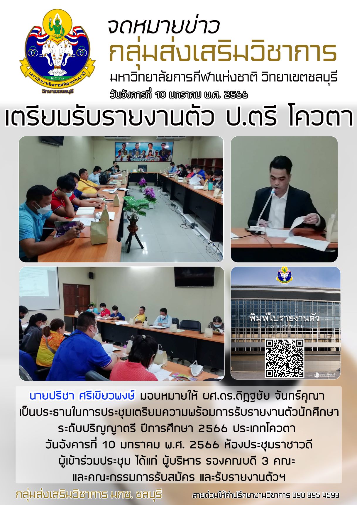 วันอังคารที่ 10 มกราคม 2566 นายปรีชา ศรีเขียวพงษ์ มอบหมายให้ ผศ.ดร.ดิฏฐชัย จันทร์คุณา เป็นประธานในการประชุมเตรียมความพร้อมรับรายงานตัว นักศึกษาระดับปริญญาตรี ปีการศึกษา 2566 ประเภทโควตา