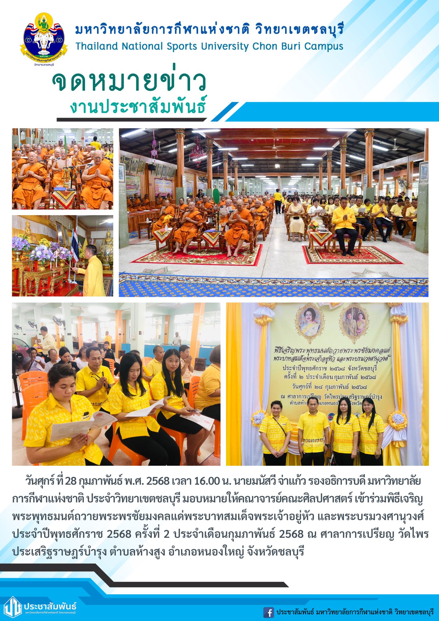 วันศุกร์ ที่ 28 กุมภาพันธ์ พ.ศ. 2568 เวลา 16.00 น. นายมนัสวี จ่าแก้ว รองอธิการบดี มหาวิทยาลัยการกีฬาแห่งชาติ ประจำวิทยาเขตชลบุรี มอบหมายให้คณาจารย์คณะศิลปศาสตร์ เข้าร่วมพิธีเจริญพระพุทธมนต์ถวายพระพรชัยมงคลแด่พระบาทสมเด็จพระเจ้าอยู่หัว และพระบรมวงศานุวงศ์ ประจำปีพุทธศักราช 2568 ครั้งที่ 2 ประจำเดือนกุมภาพันธ์ 2568 ณ ศาลาการเปรียญ วัดไพรประเสริฐราษฎร์บำรุง ตำบลห้างสูง อำเภอหนองใหญ่ จังหวัดชลบุรี