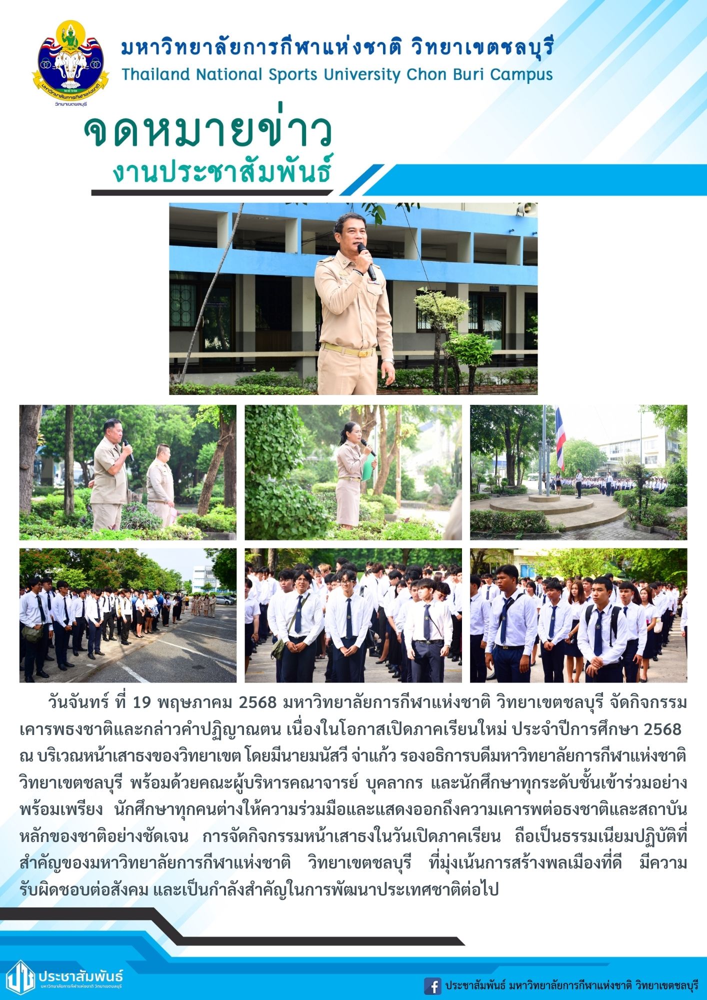 วันจันทร์ ที่ 19 พฤษภาคม 2568 มหาวิทยาลัยการกีฬาแห่งชาติ วิทยาเขตชลบุรี จัดกิจกรรมเคารพธงชาติและกล่าวคำปฏิญาณตน เนื่องในโอกาสเปิดภาคเรียนใหม่ ประจำปีการศึกษา 2568 ณ บริเวณหน้าเสาธงของวิทยาเขต โดยมีนายมนัสวี จ่าแก้ว รองอธิการบดีมหาวิทยาลัยการกีฬาแห่งชาติ วิทยาเขตชลบุรี พร้อมด้วยคณะผู้บริหารคณาจารย์ บุคลากร และนักศึกษาทุกระดับชั้นเข้าร่วมอย่างพร้อมเพรียง นักศึกษาทุกคนต่างให้ความร่วมมือและแสดงออกถึงความเคารพต่อธงชาติและสถาบันหลักของชาติอย่างชัดเจน การจัดกิจกรรมหน้าเสาธงในวันเปิดภาคเรียน ถือเป็นธรรมเนียมปฏิบัติที่สำคัญของมหาวิทยาลัยการกีฬาแห่งชาติ วิทยาเขตชลบุรี ที่มุ่งเน้นการสร้างพลเมืองที่ดี มีความ รับผิดชอบต่อสังคม และเป็นกำลังสำคัญในการพัฒนาประเทศชาติต่อไป.jpg)