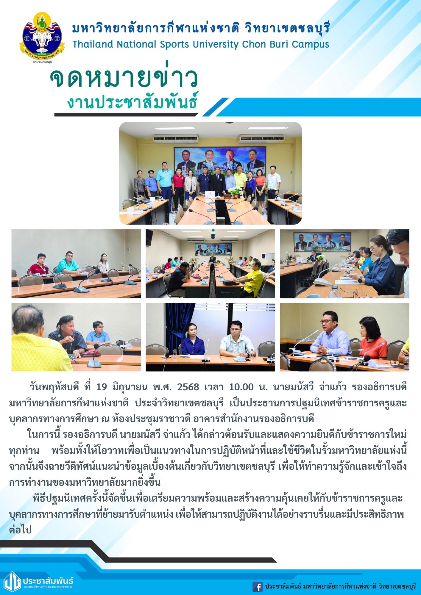 วันพฤหัสบดี ที่ 19 มิถุนายน พ.ศ. 2568 เวลา 10.00 น. นายมนัสวี จ่าแก้ว รองอธิการบดีมหาวิทยาลัยการกีฬาแห่งชาติ ประจำวิทยาเขตชลบุรี เป็นประธานการปฐมนิเทศข้าราชการครูและบุคลากรทางการศึกษา ณ ห้องประชุมราชาวดี อาคารสำนักงานรองอธิการบดี ในการนี้ รองอธิการบดี นายมนัสวี จ่าแก้ว ได้กล่าวต้อนรับและแสดงความยินดีกับข้าราชการใหม่ ทุกท่าน พร้อมทั้งให้โอวาทเพื่อเป็นแนวทางในการปฏิบัติหน้าที่และใช้ชีวิตในรั้วมหาวิทยาลัยแห่งนี้ จากนั้นจึงฉายวีดิทัศน์แนะนำข้อมูลเบื้องต้นเกี่ยวกับวิทยาเขตชลบุรี เพื่อให้ทำความรู้จักและเข้าใจถึงการทำงานของมหาวิทยาลัยมากยิ่งขึ้น พิธีปฐมนิเทศครั้งนี้จัดขึ้นเพื่อเตรียมความพร้อมและสร้างความคุ้นเคยให้กับข้าราชการครูและ บุคลากรทางการศึกษาที่ย้ายมารับตำแหน่ง เพื่อให้สามารถปฏิบัติงานได้อย่างราบรื่นและมีประสิทธิภาพ ต่อไป