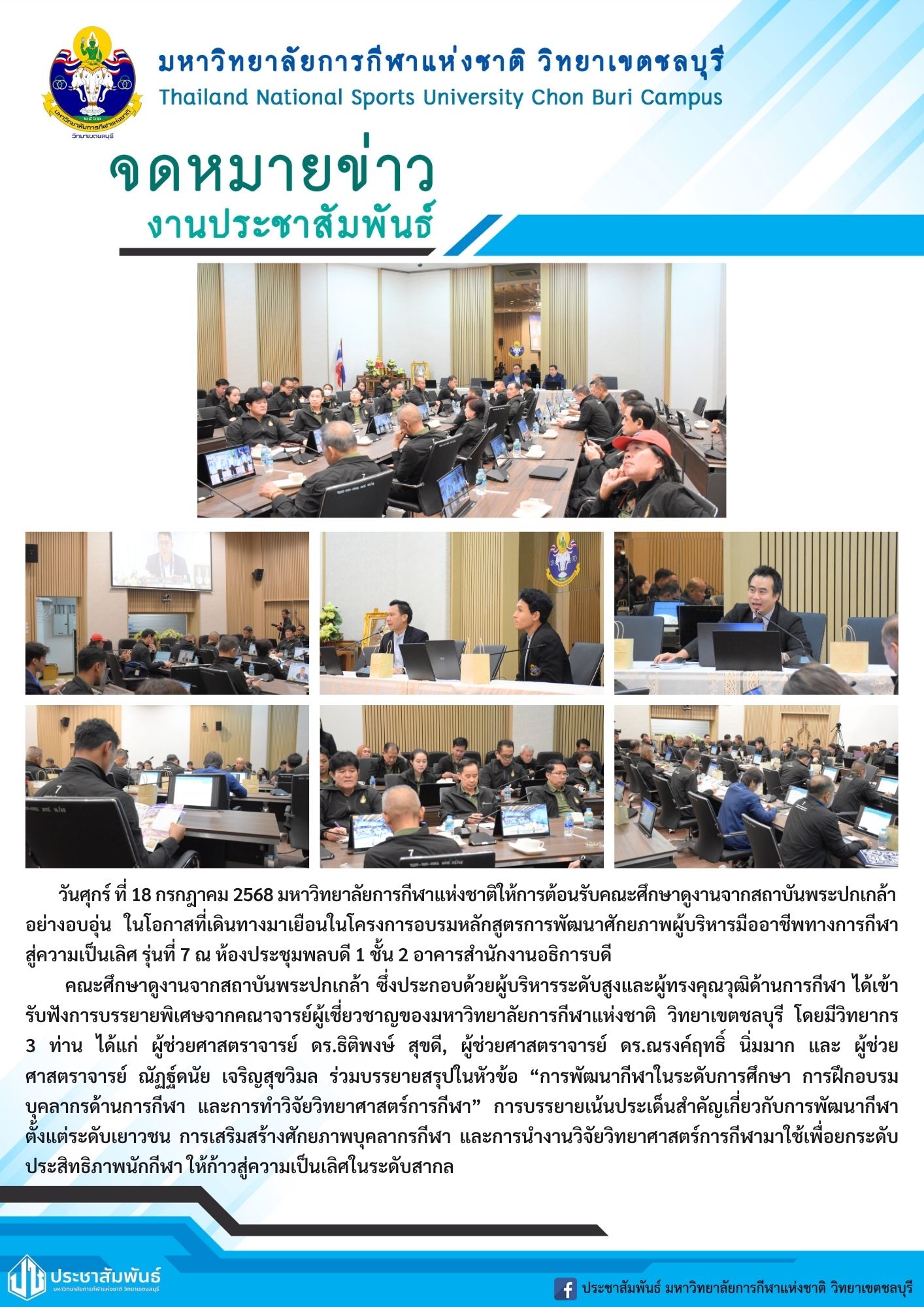 วันศุกร์ ที่ 18 กรกฎาคม 2568 มหาวิทยาลัยการกีฬาแห่งชาติให้การต้อนรับคณะศึกษาดูงานจากสถาบันพระปกเกล้า อย่างอบอุ่น ในโอกาสที่เดินทางมาเยือนในโครงการอบรมหลักสูตรการพัฒนาศักยภาพผู้บริหารมืออาชีพทางการกีฬาสู่ความเป็นเลิศ รุ่นที่ 7 ณ ห้องประชุมพลบดี 1 ชั้น 2 อาคารสำนักงานอธิการบดี คณะศึกษาดูงานจากสถาบันพระปกเกล้า ซึ่งประกอบด้วยผู้บริหารระดับสูงและผู้ทรงคุณวุฒิด้านการกีฬา ได้เข้ารับฟังการบรรยายพิเศษจากคณาจารย์ผู้เชี่ยวชาญของมหาวิทยาลัยการกีฬาแห่งชาติ วิทยาเขตชลบุรี โดยมีวิทยากร 3 ท่าน ได้แก่ ผู้ช่วยศาสตราจารย์ ดร.ธิติพงษ์ สุขดี, ผู้ช่วยศาสตราจารย์ ดร.ณรงค์ฤทธิ์ นิ่มมาก และ ผู้ช่วยศาสตราจารย์ ณัฏฐ์ดนัย เจริญสุขวิมล ร่วมบรรยายสรุปในหัวข้อ “การพัฒนากีฬาในระดับการศึกษา การฝึกอบรมบุคลากรด้านการกีฬา และการทำวิจัยวิทยาศาสตร์การกีฬา” การบรรยายเน้นประเด็นสำคัญเกี่ยวกับการพัฒนากีฬาตั้งแต่ระดับเยาวชน การเสริมสร้างศักยภาพบุคลากรกีฬา และการนำงานวิจัยวิทยาศาสตร์การกีฬามาใช้เพื่อยกระดับประสิทธิภาพนักกีฬา ให้ก้าวสู่ความเป็นเลิศในระดับสากล