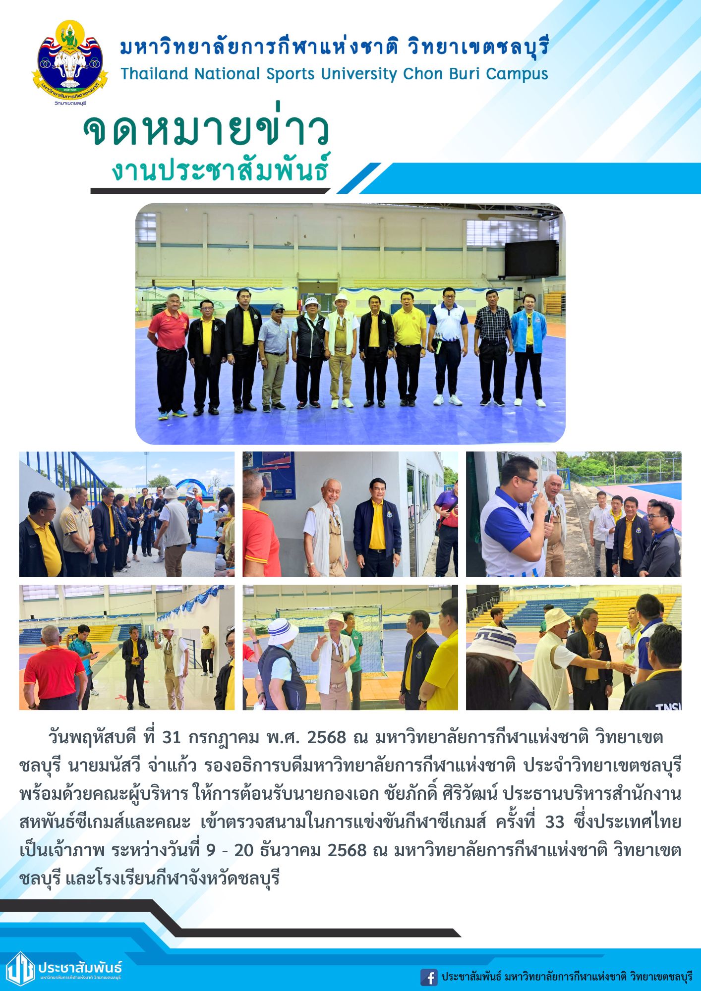 วันพฤหัสบดี ที่ 31 กรกฎาคม พ.ศ. 2568 ณ มหาวิทยาลัยการกีฬาแห่งชาติ วิทยาเขตชลบุรี นายมนัสวี จ่าแก้ว รองอธิการบดีมหาวิทยาลัยการกีฬาแห่งชาติ ประจำวิทยาเขตชลบุรี พร้อมด้วยคณะผู้บริหาร ให้การต้อนรับนายกองเอก ชัยภักดิ์ ศิริวัฒน์ ประธานบริหารสำนักงานสหพันธ์ซีเกมส์และคณะ เข้าตรวจสนามในการแข่งขันกีฬาซีเกมส์ ครั้งที่ 33 ซึ่งประเทศไทยเป็นเจ้าภาพ ระหว่างวันที่ 9 - 20 ธันวาคม 2568 ณ มหาวิทยาลัยการกีฬาแห่งชาติ วิทยาเขตชลบุรี และโรงเรียนกีฬาจังหวัดชลบุรี