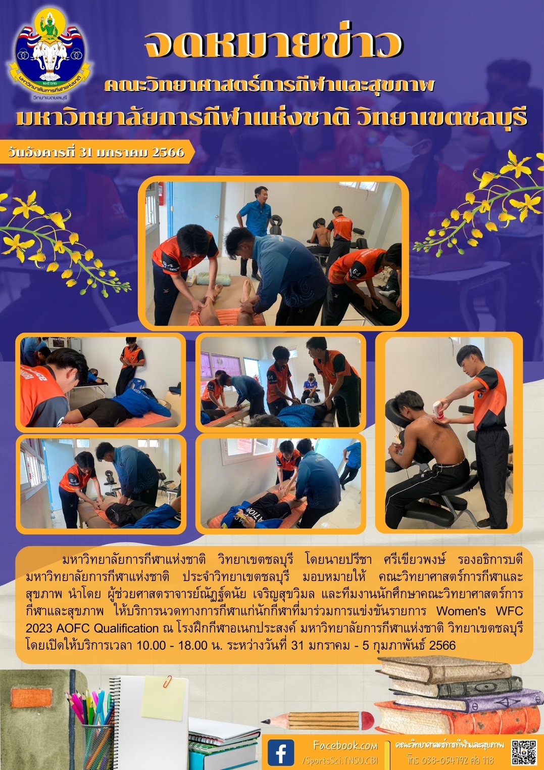 นายปรีชา ศรีเขียวพงษ์ รองอธิการบดี มหาวิทยาลัยการกีฬาแห่งชาติ ประจำวิทยาขตชลบุรี มอบหมายให้ คณะวิทยาศาสตร์การกีฬาและ สุข ภาพ นำโดย ผู้ช่วยศาสตราจารย์ณัฏฐ์ดนัย เจริญสุขวิมล และทีมงานนักศึกษาคณะวิทยาศาสตร์การ กี่ฬาและสุขภาพ ให้บริการนวดทางการกีฬาแก่นักกี้ฬาที่มาร่วมการแข่งขันรายการ Women's WFC 2023 AOF C Qualification ณ โรงฝึกกีฬาอเนกประสงค์ มหวิทยาลัยการกีฬาแห่งชาติ วิทยาเขตชลบุรี