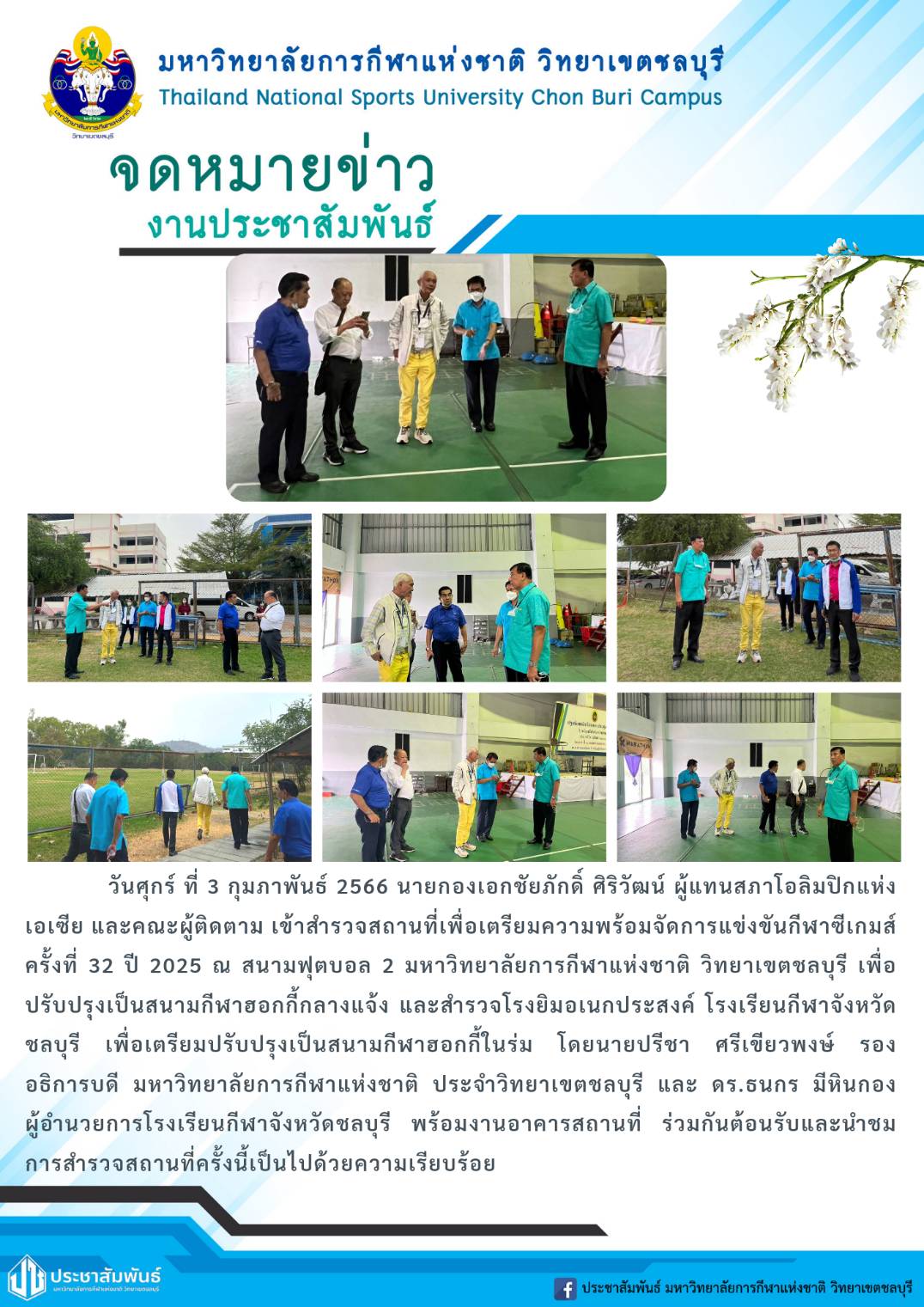 ผู้แทนสภาโอลิมปิกแห่ง เอเชีย และคณะผู้ติดตาม เข้าสำรวจสถานที่เพื่อเตรียมความพร้อมจัดการแข่งขันกีฬาซีเกมส์ ครั้งที่ 32 ปี 2025 ณ สนามฟุตบอล 2 มหาวิทยาลัยการกีฬาแห่งชาติ วิทยาเขตชลบุรี เพื่อ ปรับปรุงเป็นสนามกีฬาฮอกกี้กลางแจ้ง และสำรวจโรงยิมอเนกประสงค์ โรงเรียนกีฬาจังหวัด ชลบุรี เพื่อเตรียมปรับปรุงเป็นสนามกีฬาฮอกกี้ในร่ม โดยนายปรีชา ศรีเขียวพงษ์ รอง อธิการบดี มหาวิทยาลัยการกีฬาแห่งชาติ ประจำวิทยาเขตชลบุรี และ ดร.ธนกร มีหินกอง ผู้อำนวยการโรงเรียนกีฬาจังหวัดชลบุรี พร้อมงานอาคารสถานที่ ร่วมกันต้อนรับและนำชม การสำรวจสถานที่ครั้งนี้เป็นไปด้วยความเรียบร้อย