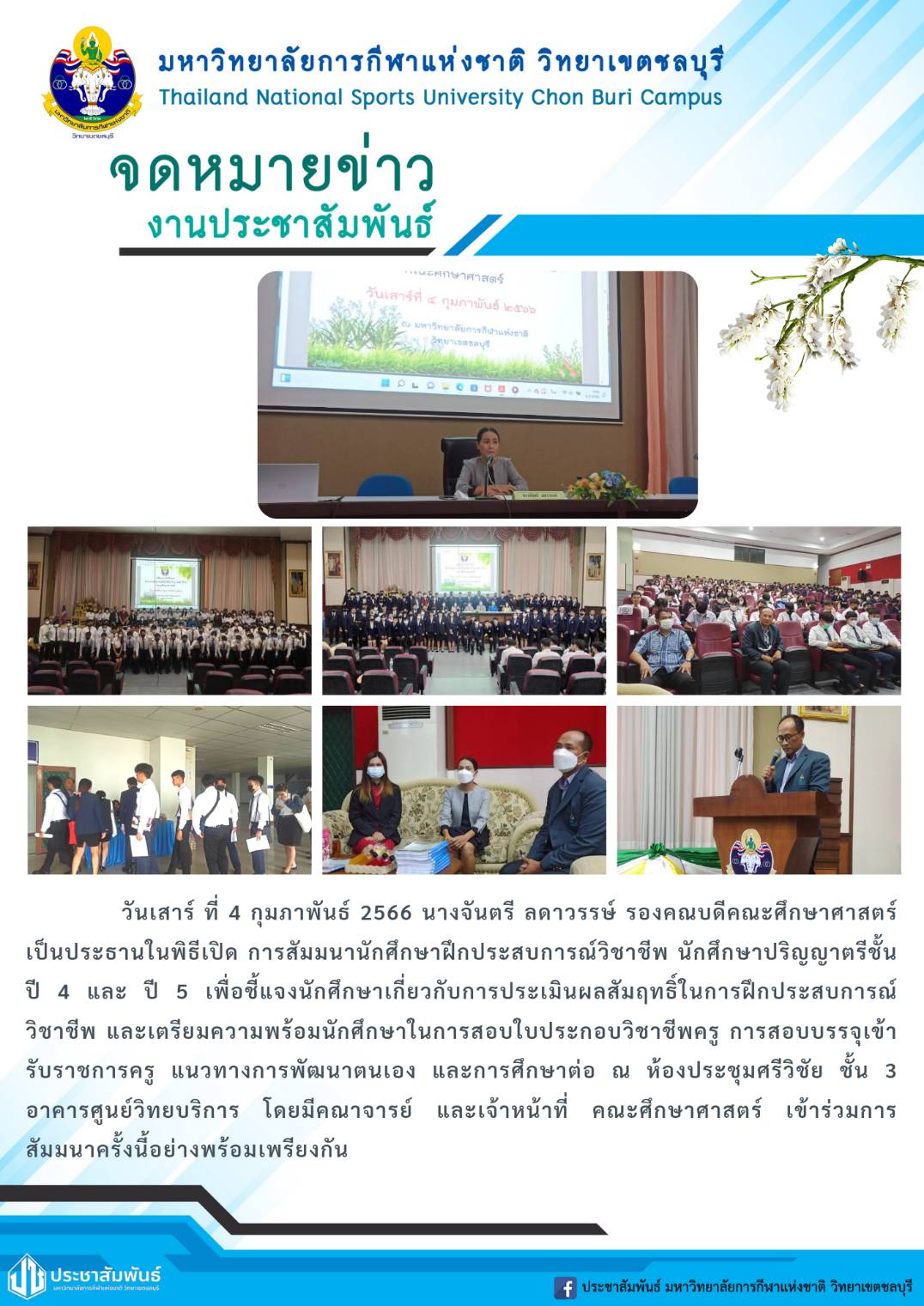 รองคณบดีคณะศึกษาศาสตร์ เป็นประธานในพิธีเปิด การสัมมนานักศึกษาฝึกประสบการณ์วิชาชีพ นักศึกษาปริญญาตรีชั้น ปี 4 และ ปี 5 เพื่อชี้แจงนักศึกษาเกี่ยวกับการประเมินผลสัมฤทธิ์ในการฝึกประสบการณ์ วิชาชีพ และเตรียมความพร้อมนักศึกษาในการสอบใบประกอบวิชาชีพครู การสอบบรรจุเข้า รับราชการครู