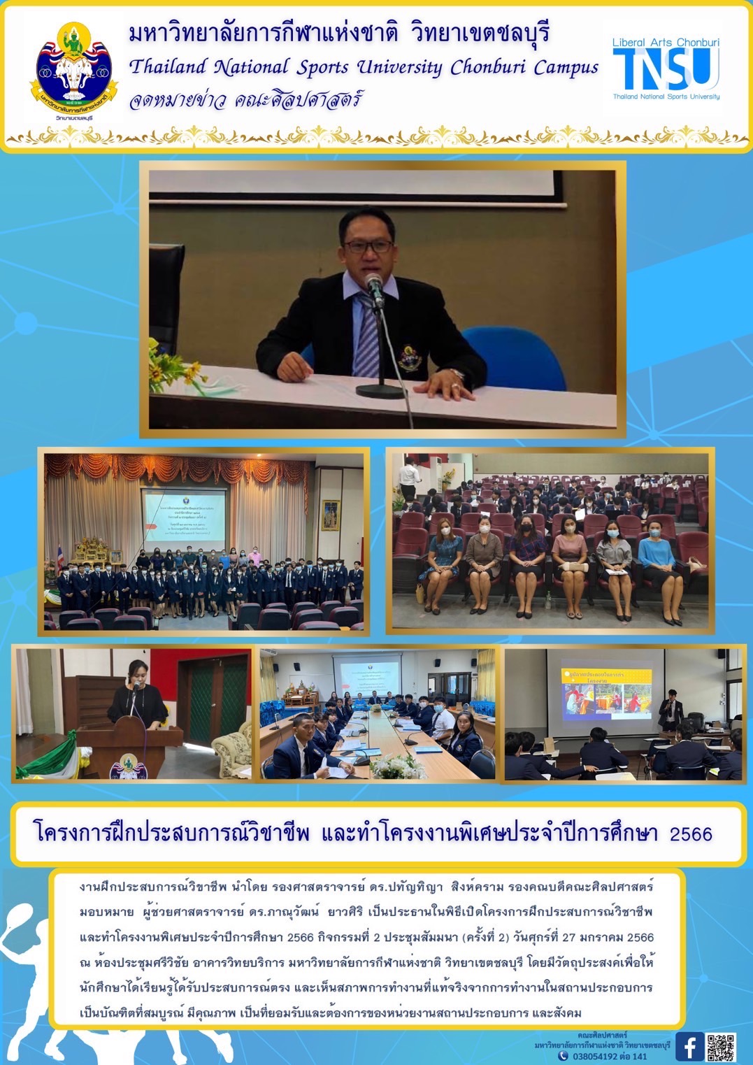 โครงการฝึกประสบการณ์วิชาชีพ และทำโครงงานพิเศษประจำปีการศึกษา 2566 งานฝึกประสบการณ์วิชาชีพ นำโดย รองศาสตราจารย์ ดร.ปทัญทิญา สิงห์คราม รองคณบดีคณะศิลปศาสตร์ มอบหมาย ผู้ช่วยศาสตราจารย์ ดร.ภาณุวัฒน์ ยาวศิริ เป็นประธานในพิธีเปิดโครงการฝึกประสบการณ์วิชาชีพ และทำโครงงานพิเศษประจำปีการศึกษา 2566 กิจกรรมที่ 2 ประชุมสัมมนา (ครั้งที่ 2) โดยมีวัตถุประสงค์เพื่อให้ นักศึกษาได้เรียนรู้ได้รับประสบการณ์ตรง และเห็นสภาพการทำงานที่แท้จริงจากการทำงานในสถานประกอบการ เป็นบัณฑิตที่สมบูรณ์ มีคุณภาพ