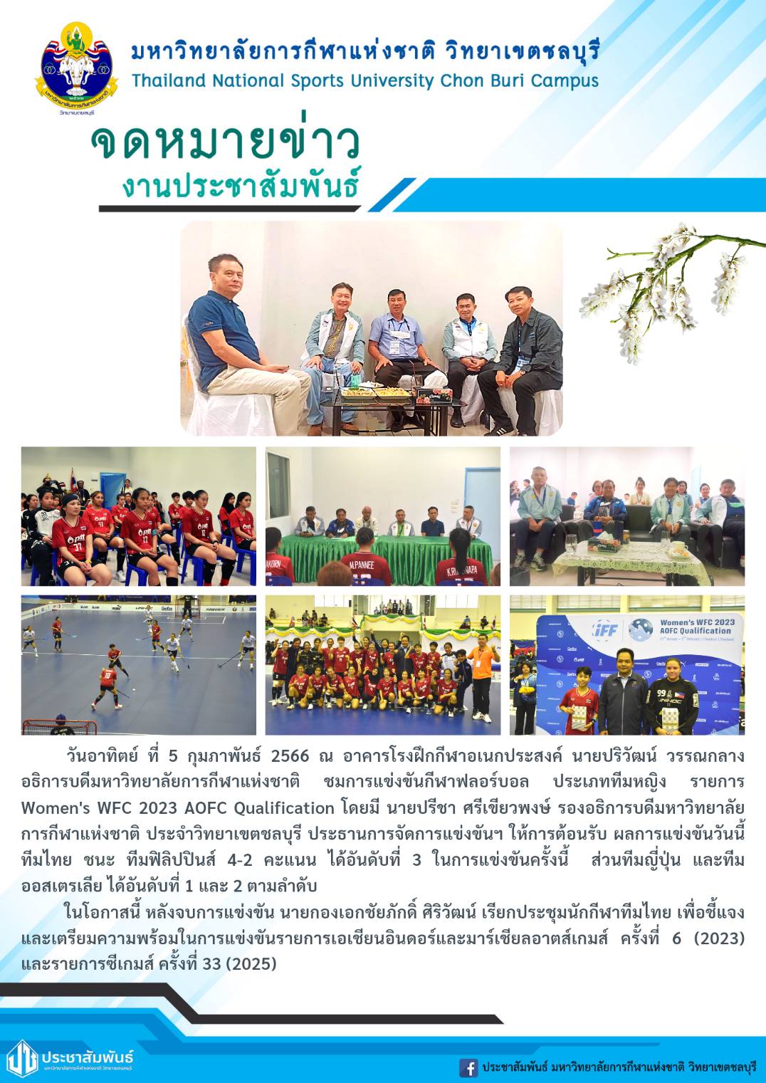 นายปริวัฒน์ วรรณกลาง อธิการบดีมหาวิทยาลัยการกีฬาแห่งชาติชมการแข่งขันกีฬาฟลอร์บอล ประเภททีมหญิง รายการ Women's WFC 2023 AOFC Qualification โดยมี นายปรีชา ศรีเขียวพงษ์ รองอธิการบดีมหาวิทยาลัย การกีฬาแห่งชาติ ประจำวิทยาเขตชลบุรี ประธานการจัดการแข่งขันฯ ให้การต้อนรับ