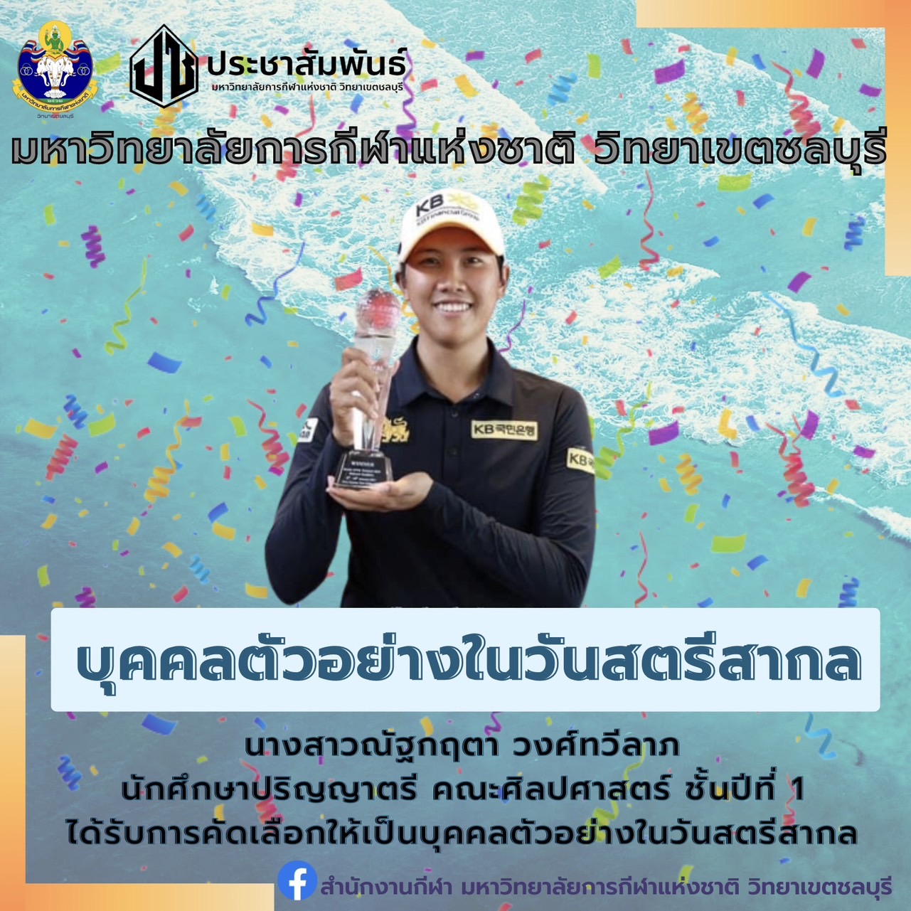 นางสาวณัฐกฤตา วงศ์ทวีลาภ นักศึกษาปริญญาตรี ชั้นปีที่ 1 คณะศิลปศาสตร์ มหาวิทยาลัยการกีฬาแห่งชาติ วิทยาเขตชลบุรี ได้รับคัดเลือกให้เป็นบุคคลตัวอย่าง ในวันสตรีสากล