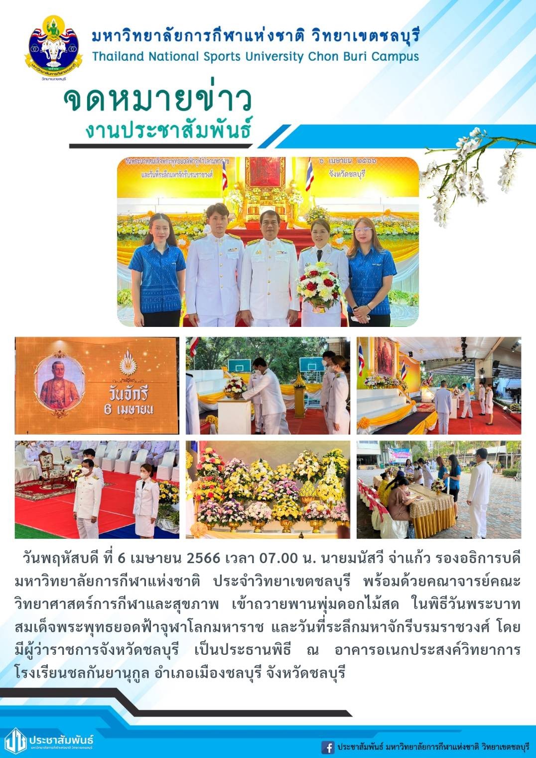 นายมนัสวี จ่าแก้ว รองอธิการบดีมหาวิทยาลัยการกีฬาแห่งชาติ ประจำวิทยาเขตชลบุรี พร้อมด้วยคณาจารย์ คณะวิทยาศาสตร์การกีฬาและสุขภาพ เข้าถวายพานุ่มดอกไม้สด ในพิธีวันพระบาทสมเด็จพระพุทธยอดฟ้าจุฬาโลก และวันที่ระลึกมหาจักรีบรมราชวงศ์ โดยมีผู้ว่าราชการจังหวัดชลบุรี เป็นประธานพิธี