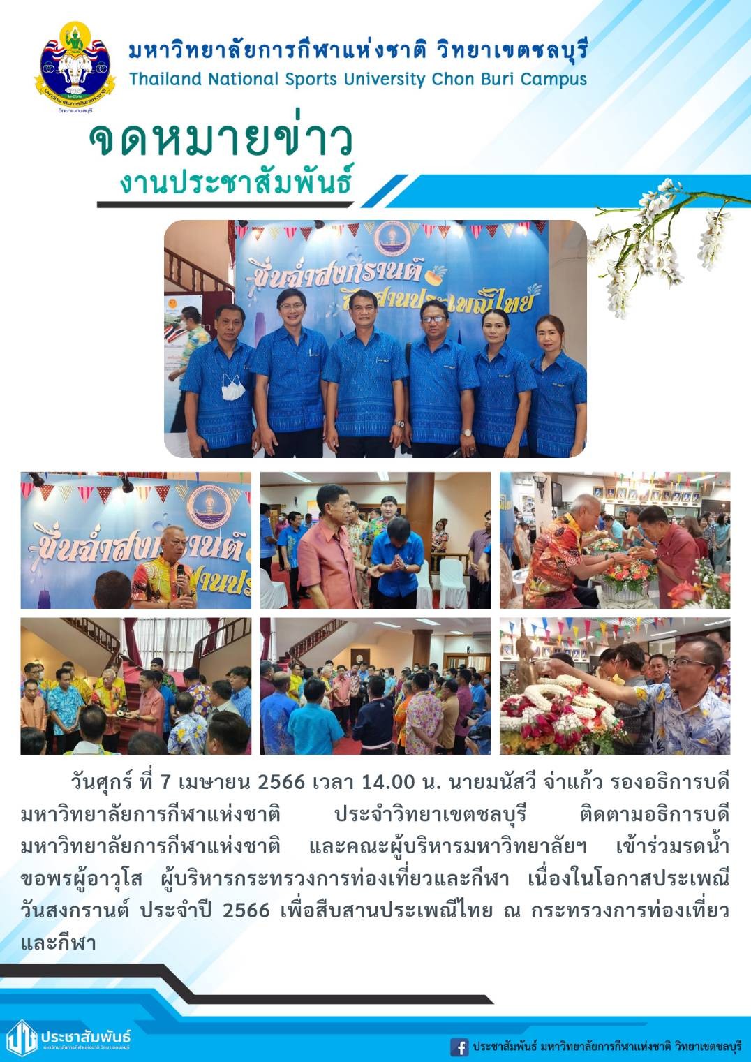 นายมนัสวี จ่าแก้ว รองอธิการบดีมหาวิทยาลัยการกีฬาแห่งชาติ ประจำวิทยาเขตชลบุรี ติดตามอธิการบดีมหาวิทยาลัยการกีฬาแห่งชาติ และคณะผู้บริหารมหาวิทยาลัยการกีฬาแห่งชาติ รดน้ำดำหัวขอพรผู้อาวุโส ผู้บริหารกระทรวงการท่องเที่ยวและกีฬา เนื่องในโอกาสวันสงกรานต์ ประจำปี 2566