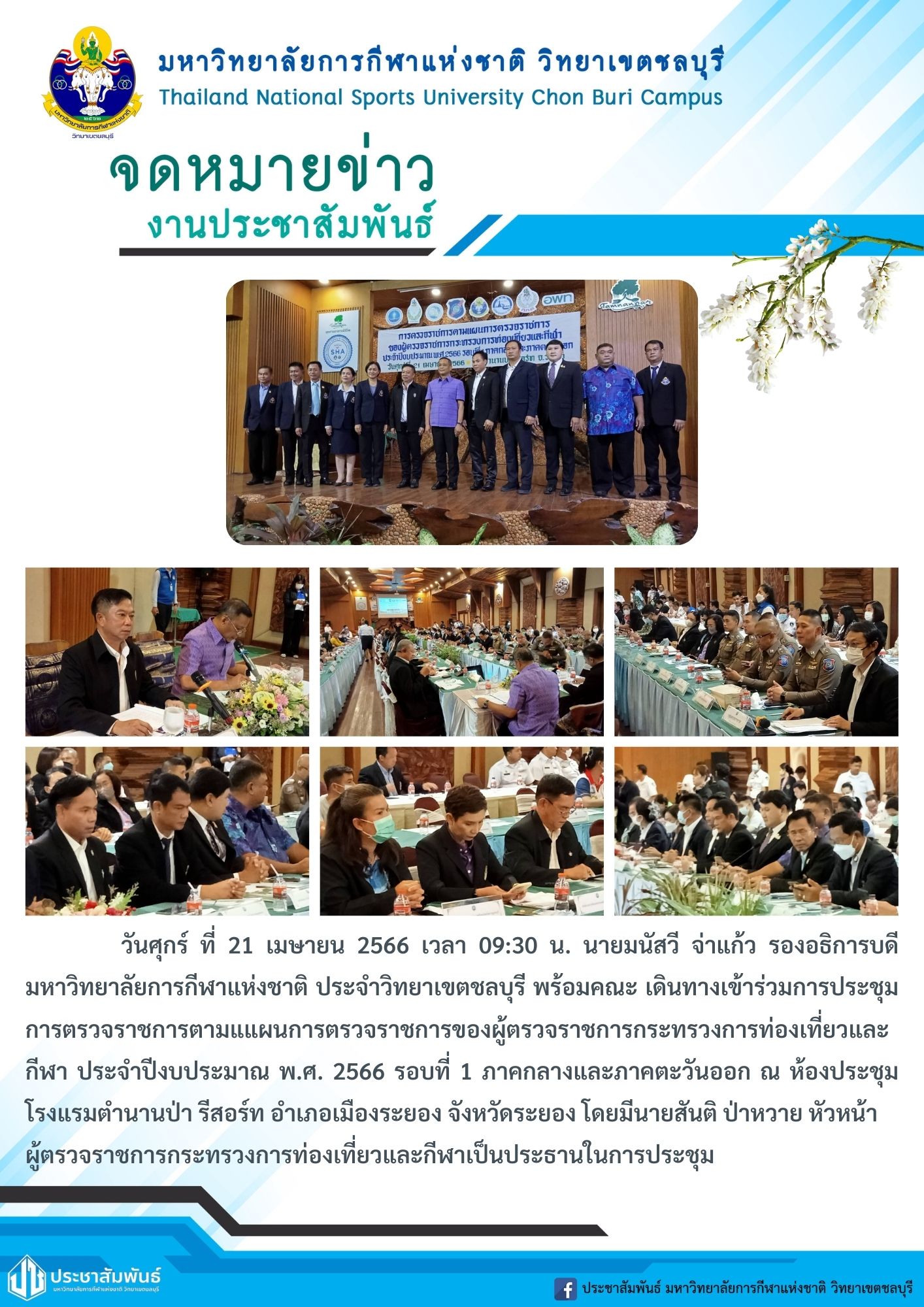 นายมนัสวี จ่าแก้ว รองอธิการบดีมหาวิทยาลัยการกีฬาแห่งชาติ ประจำวิทยาเขตชลบุรี พร้อมคณะ เดินทางเข้าร่วมการประชุมการตรวจข้าราชการตามแผนการตรวจราชการของผู้ตรวจราชการกระทรวงการท่องเที่ยวและกีฬา ประจำปี 2566 รอบที่ 1 ภาคกลางและภาคตะวันออก ณ จังหวัดระยอง