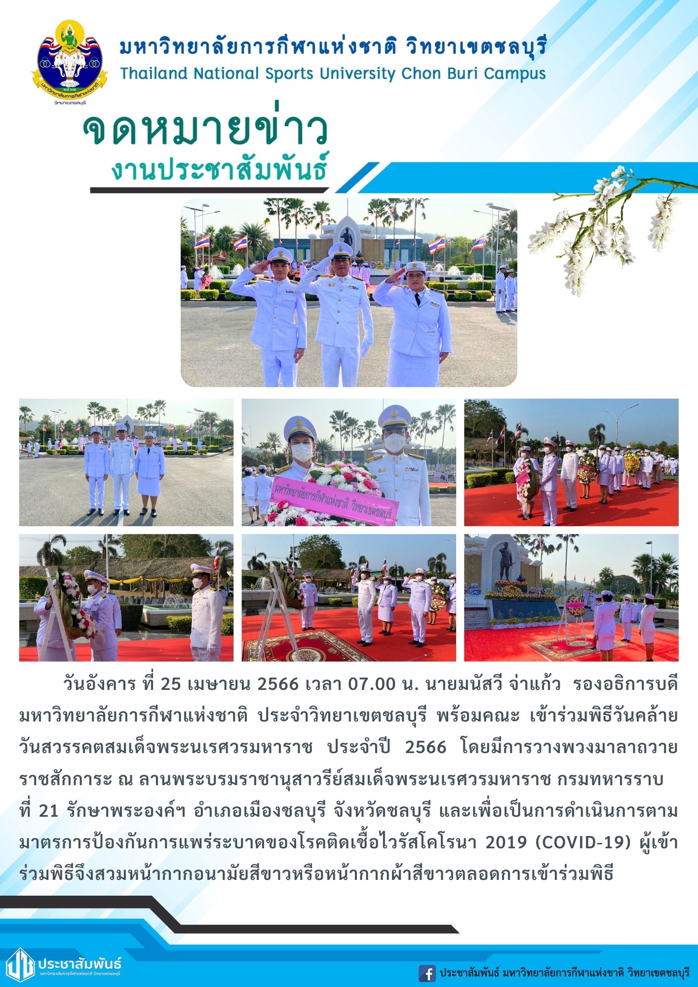 นายมนัสวี จ่าแก้ว รองอธิการบดีมหาวิทยาลัยการกีฬาแห่งชาติ ประจำวิทยาเขตชลบุรี พร้อมคณะ เข้าร่วมพิธีวันคล้ายวันสวรรคตสมเด็จพระนเรศวรมหาราช ประจำปี 2566 โดยมีการวางพวงมาลาถวายราชสักการะ ณ ลานพระบรมราชานุสาวรีย์สมเด็จพระนเรศวรมหาราช กรมทหารราบที่ 21 รักษาพระองค์