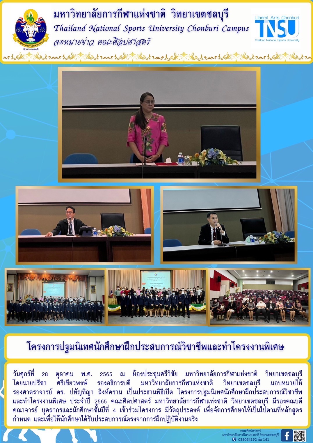 โครงการปฐมนิเทศนักศึกษาฝึกประสอบการวิชาชีพและทำโครงงานพิเศษ ประจำปี 2565 เพื่อจัดการศึกษาให้เป็นไปตามที่หลักสูตรดำหนด และเพื่อให้นักศึกษาได้รับประสบการณ์ตรงจากการฝึกปฏิบัติงานจริง วันศุกร์ที่ 28 ตุลาคม 2565 ณ ห้องประชุมศรีวิชัย มหาวิทยาลัยการกีฬาแห่งชาติ วิทยาเขตชลบุรี