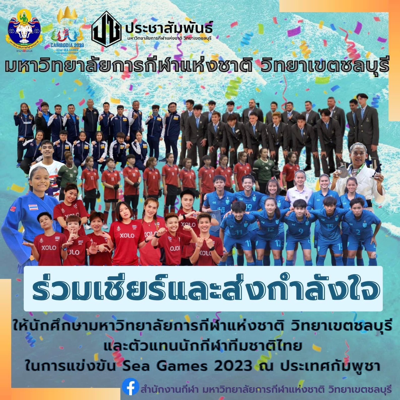 ร่วมเชียร์และส่งกำลังใจ ให้นักศึกษา ศิษย์เก่า มหาวิทยาลัยการกีฬาแห่งชาติ วิทยาเขตชลบุรี และตัวแทนนักกีฬาทีมชาติไทย ในการแข่งขัน Sea Games 2023 ระหว่างวันที่ 5 - 17 พฤษภาคม 2566 ณ ประเทศกัมพูชาชนิดกีฬาที่มีนักศึกษา และศิษย์เก่ามหาวิทยาลัยการกีฬาแห่งชาติ วิทยาเขตชลบุรีเข้าร่วมการแข่งขัน