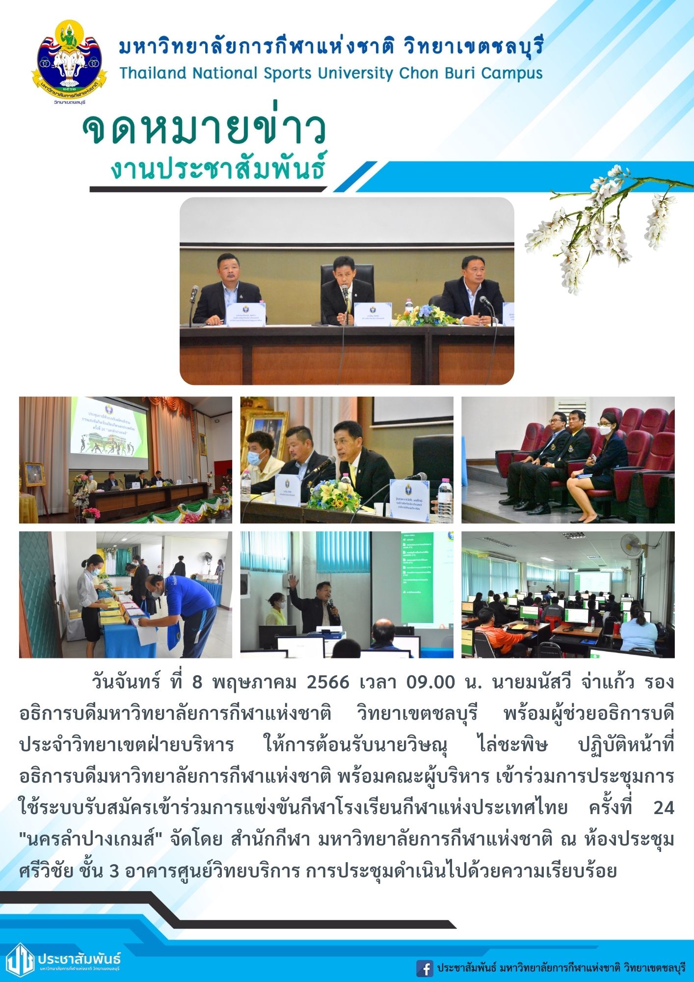 นายมนัสวี จ่าแก้ว รองอธิการบดีมหาวิทยาลัยการกีฬาแห่งชาติ ประจำวิทยาเขตชลบุรี พร้อมผู้ช่วยอธิการบดีฝ่ายบริหาร ประจำวิทยาเขตชลบุรี ให้การต้อนรับ นายวิษณุ ไล่ชะพิษ ปฏิบัติหน้าที่อธิการบดีมหาวิทยาลัยการกีฬาแห่งชาติ พร้อมคณะผู้บริหาร เข้าร่วมการประชุม การใช้ระบบรับสมัครเข้าร่วมแข่งขันกีฬาโรงเรียนกีฬาแห่งประเทศไทย ครั้งที่ 24 นครลำปางเกมส์