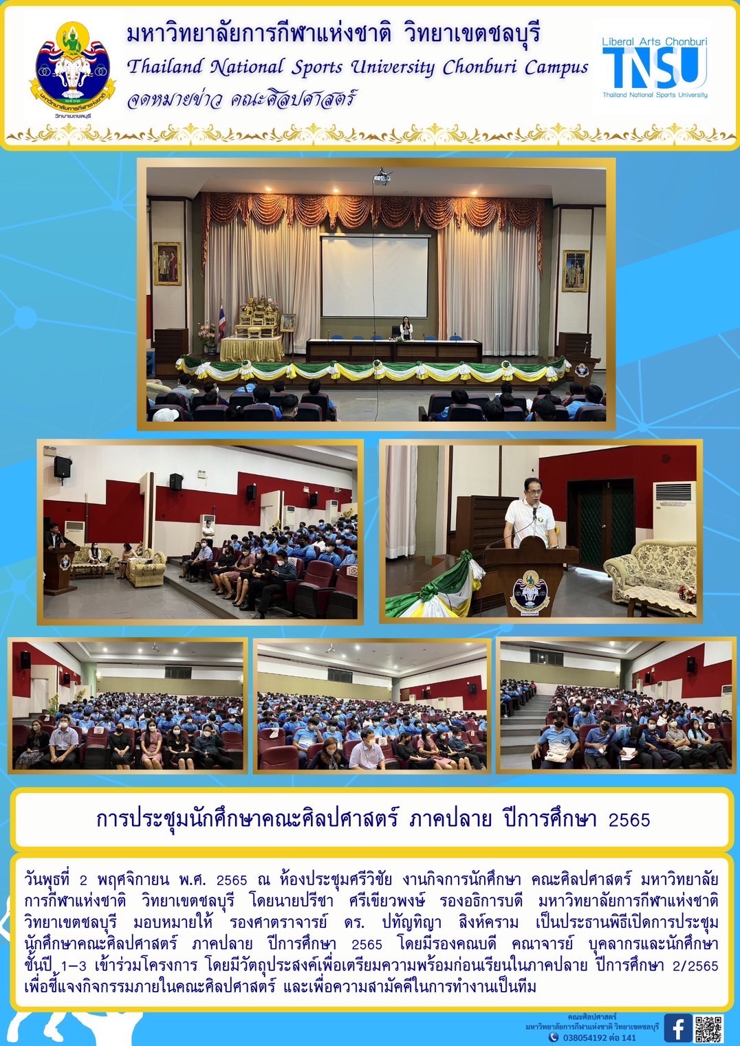 การประชุมนักศึกษาคณะศิลปศาสตร์ ภาคปลาย ปีการศึกษา 2565 วันพุธที่ 2 พฤศจิกายน พ.ศ. 2565 ณ ห้องประชุมคณะศิลปศาสตร์ มหาวิทยาลัยการกีฬาแห่งชาติ วิทยาเขตชลบุรี เพื่อเตรียมความพร้อมก่อนเรียนในภาคปลาย ปีการศึกษา 2/2565 เพื่อชี้แจงกิจกรรมภายในคณะศิลปศาสตร์ และเพื่อความสามัคคีในการทำงานเป็นทีม