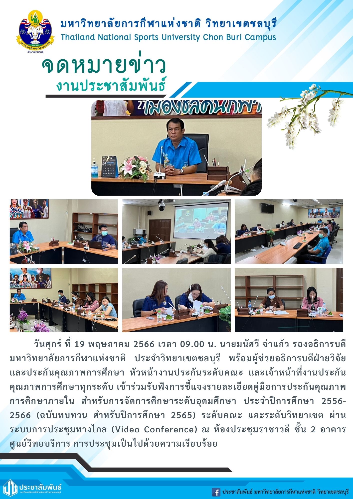 นายมนัสวี จ่าแก้ว รองอธิการบดีมหาวิทยาลัยการกีฬาแห่งชาติ ประจำวิทยาเขตชลบุรี พร้อมผู้ช่วยอธิการบดีฝ่ายวิจัยและประกันคุณภาพการศึกษา เข้าร่วมการประชุมการชี้แจงรายละเอียดคู่มือการประกันคุณภาพการศึกษาภายใน สำหรับการจัดการศึกษาระดับอุดมศึกษา ประจำปีการศึกษา 2556-2566 สำหรับปีการศึกษา 2565