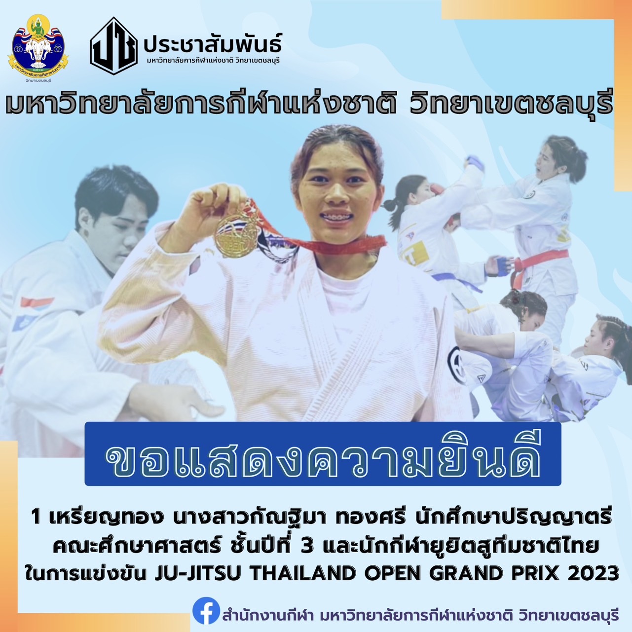 ขอแสดงความยินดี กับ “นางสาวกัณฐิมา ทองศรี” นักศึกษาปริญญาตรี คณะศึกษาศาสตร์ ชั้นปีที่ 3 ได้รับรางวันชนะเลิศ 1 เหรียญทอง ในการเข้าร่วมแข่งขัน JU-JITSU THAILAND OPEN GRAND PRIX 2023