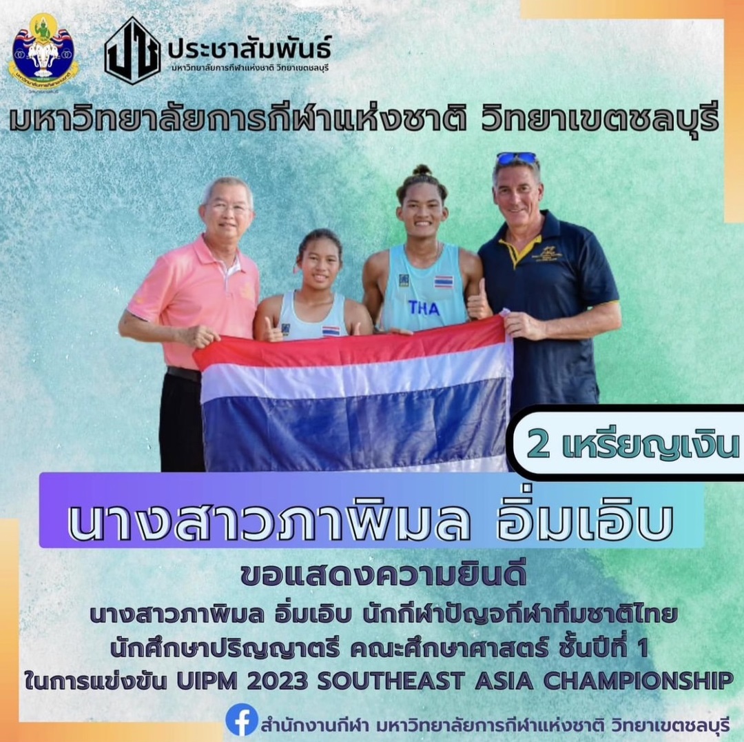 ขอแสดงความยินดี กับ “นางสาวภาพิมล อิ่มเอิบ” นักกีฬาปัญจกีฬาทีมชาติไทย นักศึกษาปริญญาตรี คณะศึกษาศาสตร์ ชั้นปีที่ 1 มหาวิทยาลัยการกีฬาแห่งชาติ วิทยาเขตชลบุรี1 เหรียญเงิน ประเภท Laser Run Women