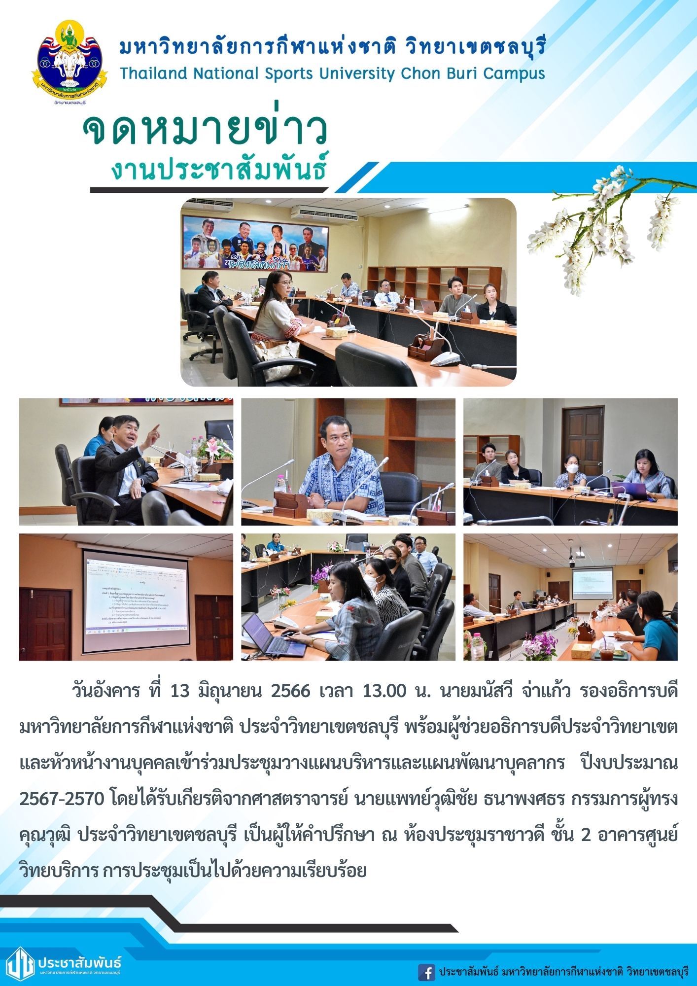 นายมนัสวี จ่าแก้ว รองอธิการบดีมหาวิทยาลัยการกีฬาแห่งชาติ ประจำวิทยาเขตชลบุรี พร้อมผู้ช่ายอธิการบดีประจำวิทยาเขต เข้าร่วมประชุมวางแผนบริหารและแผนพัฒนาบุคลากร ปีงบประมาณ 2567-2570