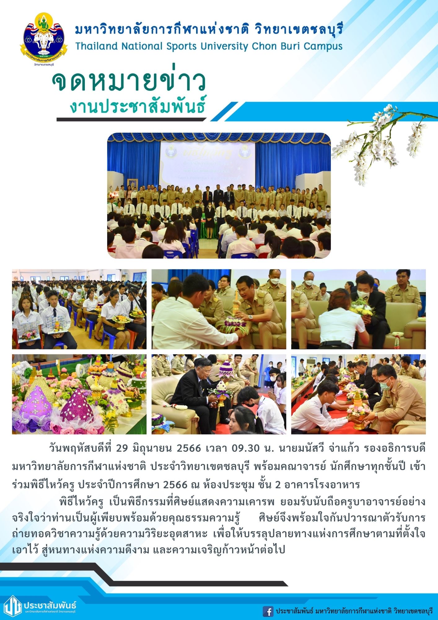 นายมนัสวี จ่าแก้ว รองอธิการบดีมหาวิทยาลัยการกีฬาแห่งชาติ ประจำวิทยาเขตชลบุรี พร้อมคณาจารย์ นักศึกาาทุกชั้นปี เข้าร่วมพิธีไหว้ครู ประจำปีการศึกษา 2566