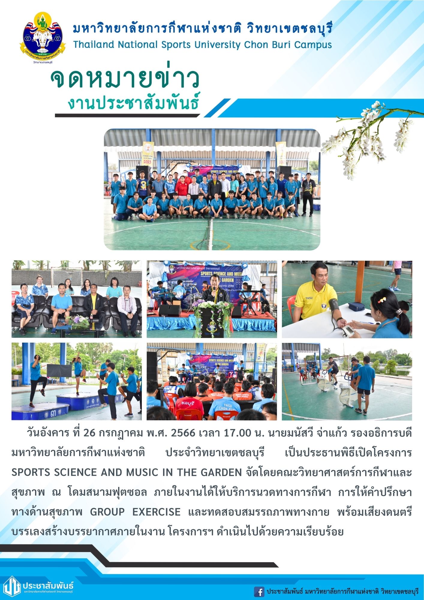 นายมนัสวี จ่าแก้ว รองอธิการบดีมหาวิทยาลัยการกีฬาแห่งชาติ ประจำวิทยาเขตชลบุรี เป็นประธานพิธีเปิดโครงการ Sports Science and Music in the Garden จัดโดยคณะวิทยาศาสตร์การกีฬาและสุขภาพ