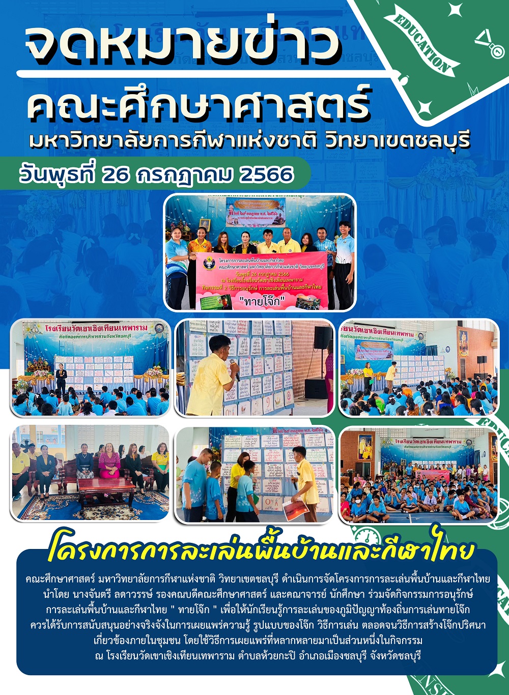 คณะศึกษาศาสตร์ มหาวิทยาลัยการกีฬาแห่ชาติ วิทยาเขตชลบุรี นำโดย นางจันตรี ลดาวรรษ์ รองคณะบดีศึกษาศาสตร์ และคณาจารย์ นักศึกษา ร่วมดำเนินจัดกิจกรรมการอนุรักษ์การละเล่นพื้นบ้านและกีฬาไทย เพื่อให้นักเรียนรู้การละเล่นของภูมิปัญญาท้องถิ่นไทย ณ โรงเรียนวัดเขาเชิงเทียนเทพาราม ต.ห้วยกะปิ อ.เมือง จ.ชลบุรี